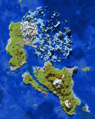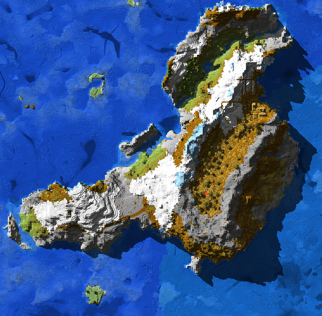 Each of the islands is on spawn and has at least one village and stone/icy/jagged peaks mountain.