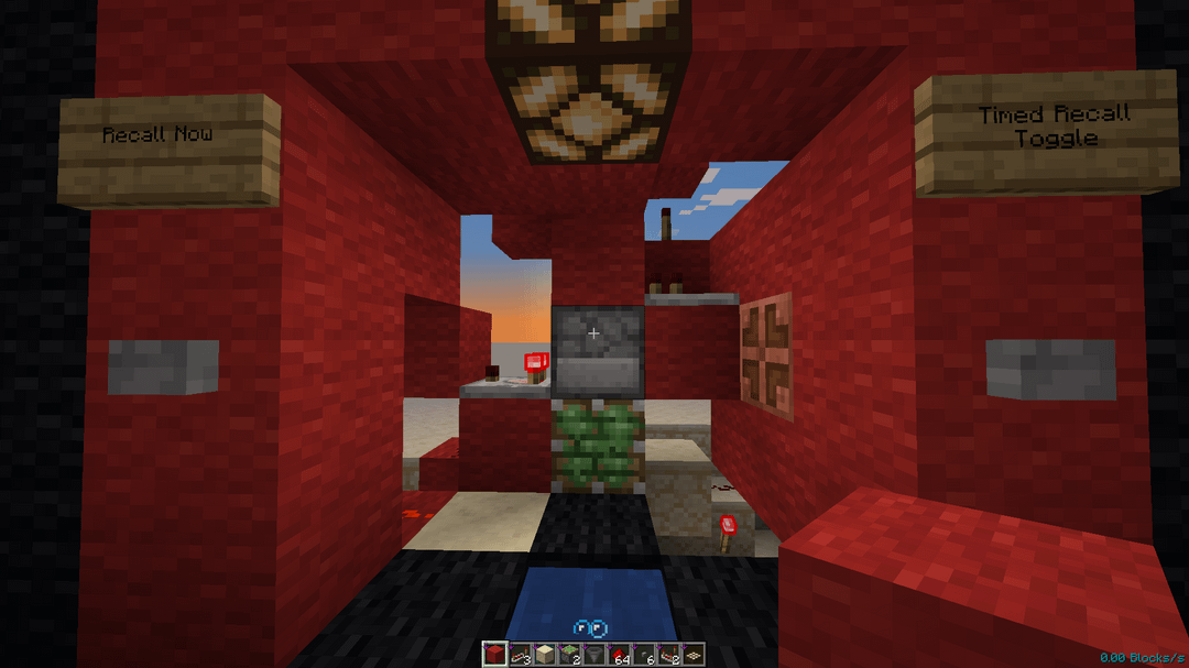 Basically it's an ender pearl stasis chamber that recalls the user when either the button on the left is pushed or the timer counts down to zero. The timer is done using a daylight sensor with a dropper and hopper, it can be adjusted from 1 to 320 items (1 to 320 day night cycles). The timer can be toggled on and off with the bottom on the left which will turn the redstone lamp on/off to signify it's status.