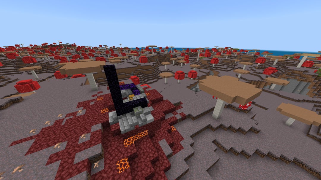 It’s completely safe (no mobs), has a huge natural cave system, and even a ruined Nether portal — all inside a single Mushroom Fields biome.