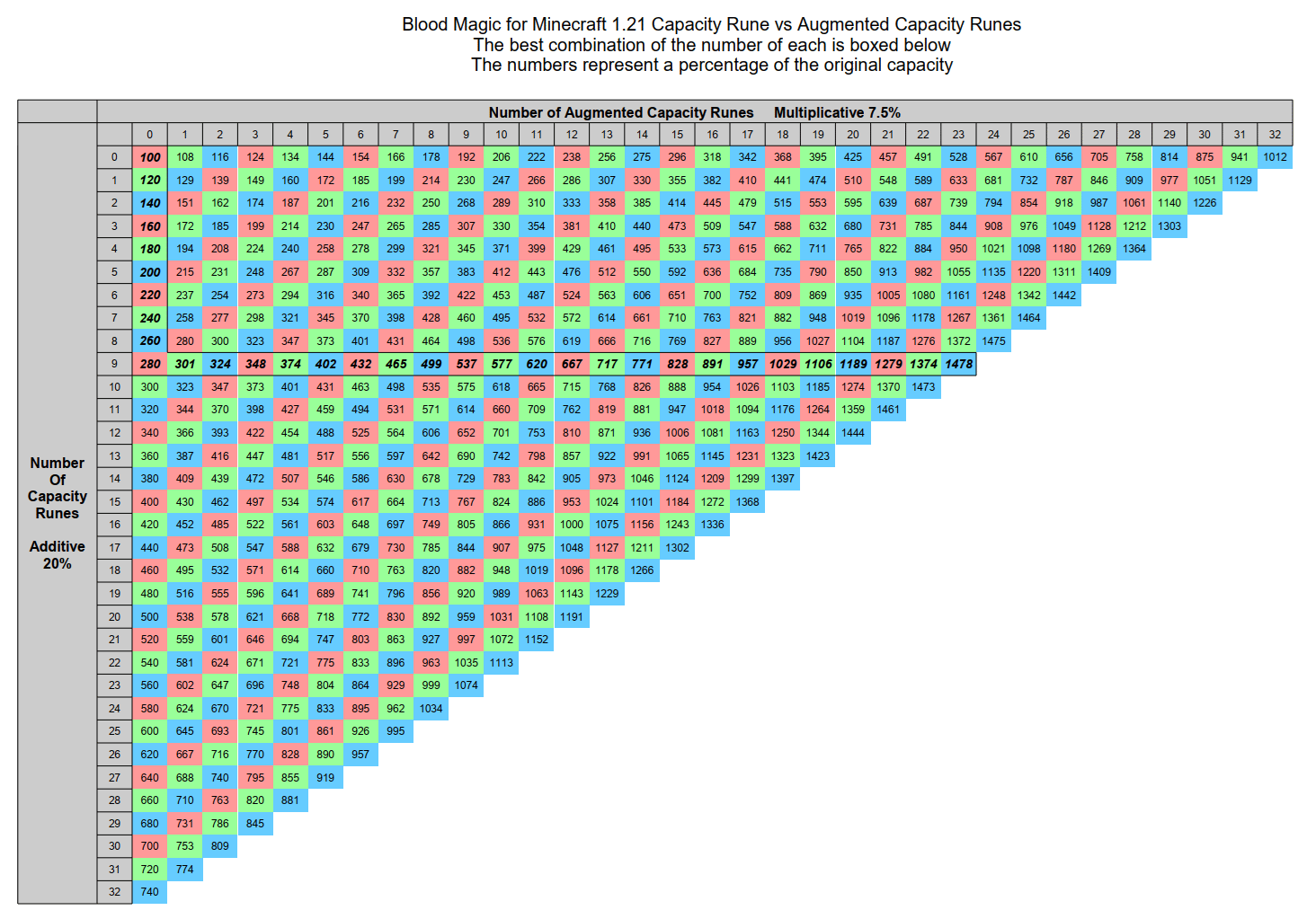 For Minecraft 1.21 I was using Blood Magic in a modpack and had just gotten to being able to make augmented capacity runes. Knowing that the original capacity runes are additive and the augmented ones are multiplicative, I wanted to know what was the best mixture between the additive ones and the multiplicative ones because the multiplicative ones don't have much to multiply unless you have some additive ones in there first. So, I made this table.
