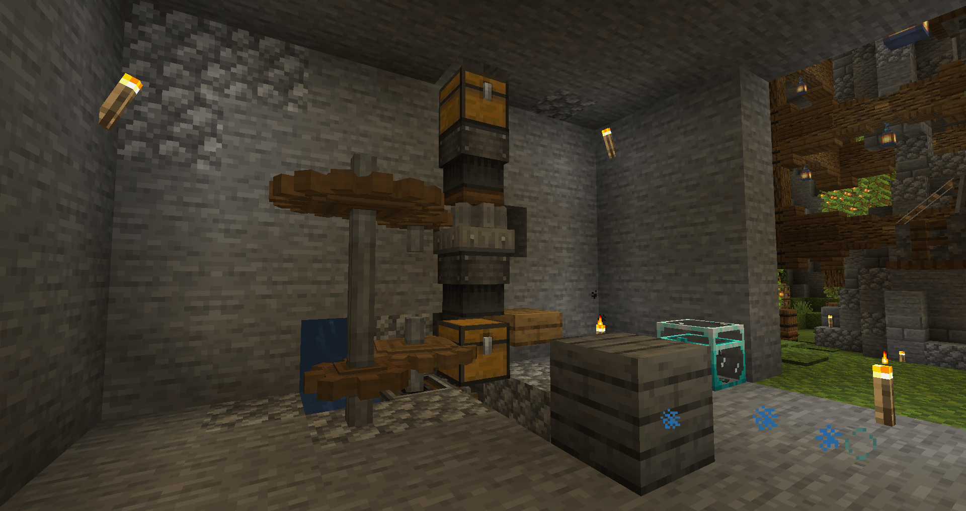 Very early game, simple setup. Water wheel on the bottom powering some cogs. I tried increasing the cog speed by adding the 2nd layer as depicted, as well as changing the direction of the rotation. It absolutely refuses to accept cobblestone in through the top, regardless of whether I place it in the chest or try throwing it in through the top. What am I missing?? I've tried watching youtube tutorials but I'm not sure what they're doing that I'm not.