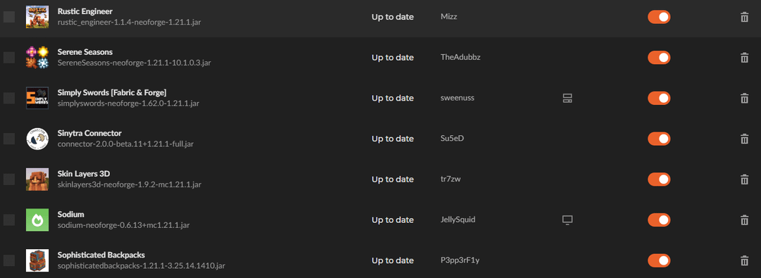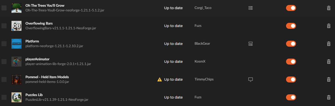 The warning signs beside the "Pommel" and "Hold My Items" mod is due to incompatibility, however because of "Sinytra Connector" they work fine. (I followed the developers requirements to run "Actually 3D" which for some reason doesn't show up in Curseforge but it is in the files)