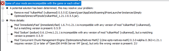 Hello! I wanted to try out the VulkanMod, but it seems it's not commpatible with the mods listed in the screenshot. I want to know if removing those three mods, so I can use VulkanMod will give me better performance. Does anyone know if Vulkanmod would be better for performance in a Vulkan-compatible PC than Sodium (among other optimization mods)?
