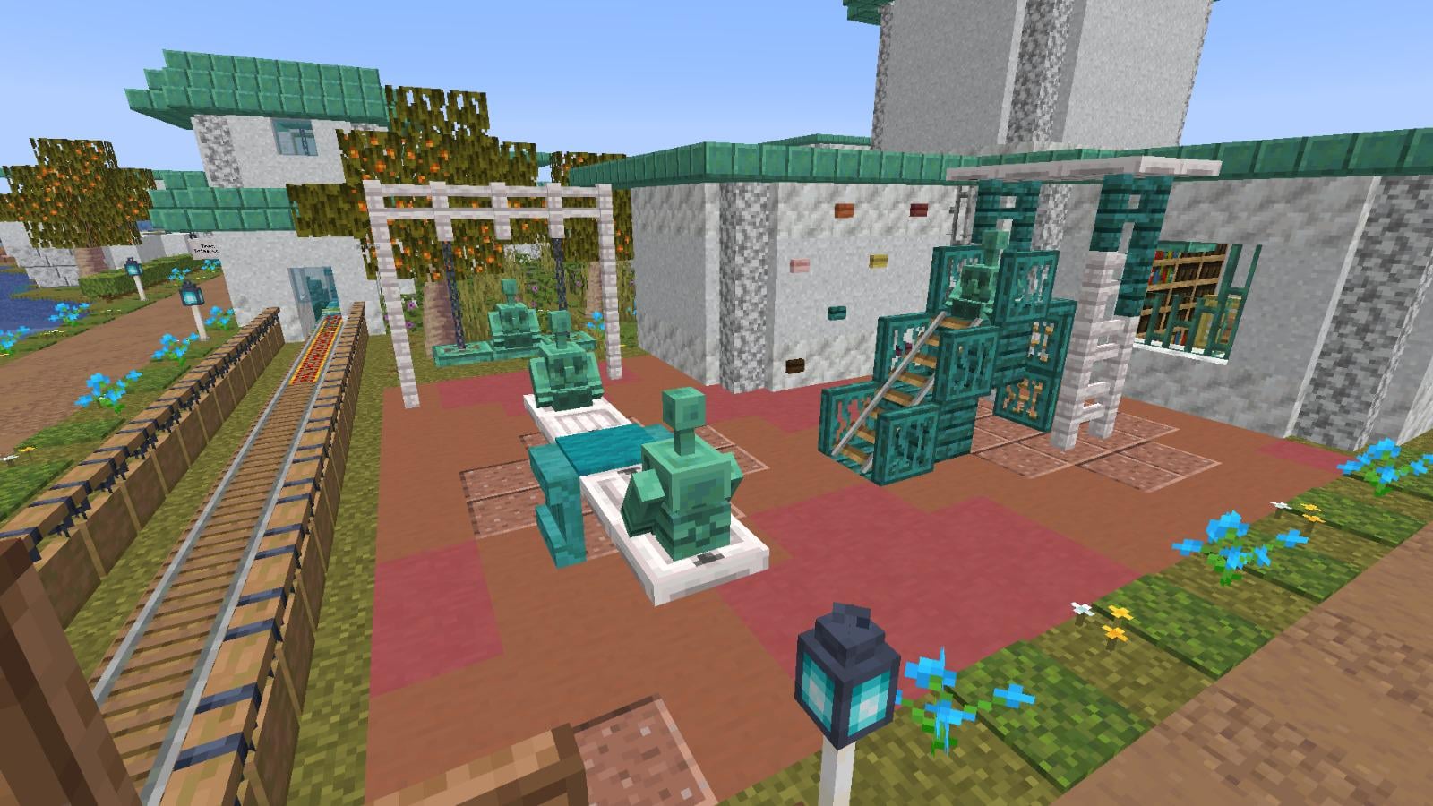 My school build had some free space next to it so I made this small playground. I think copper golems look really nice as little kids. They add so much… by Best-Watercress-5320 Minecraft Minecraft Builds
