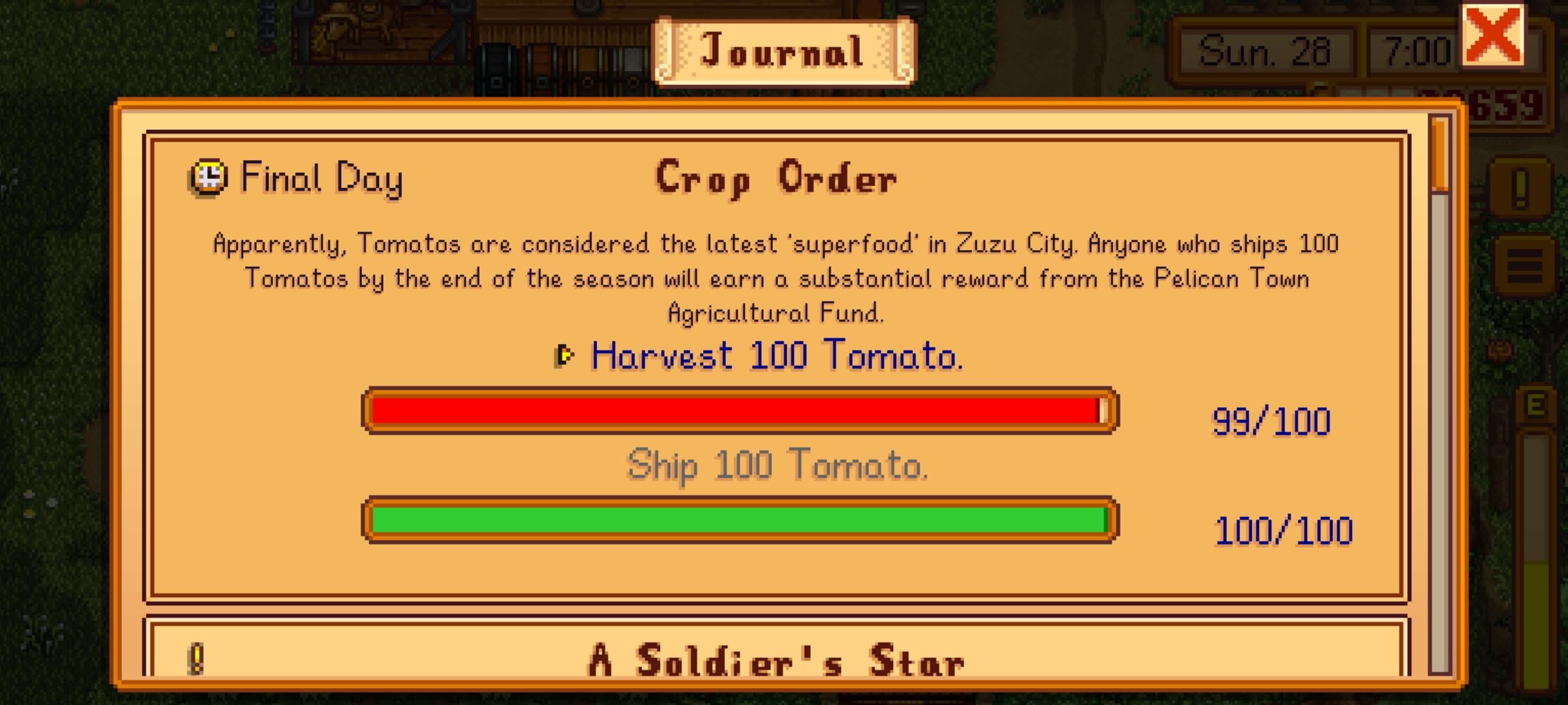 If you have a tomato stored away somewhere, use it. You need to harvest 100 tomatoes and you need to ship 100 tomatoes. But they don’t need to be the same 100.