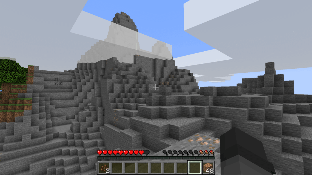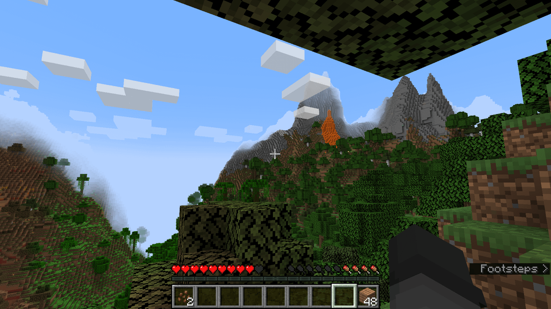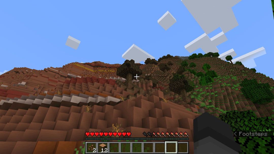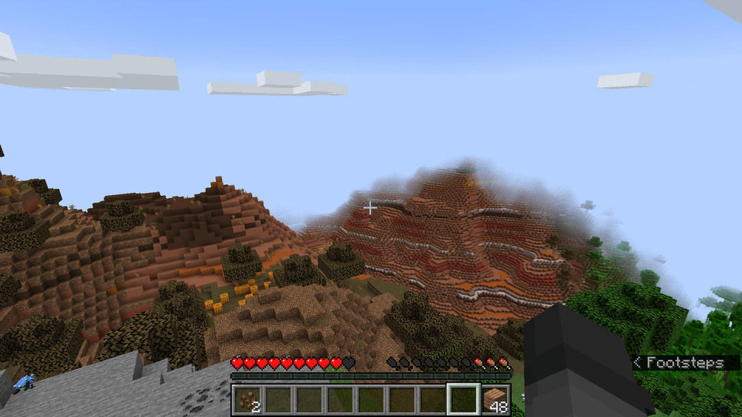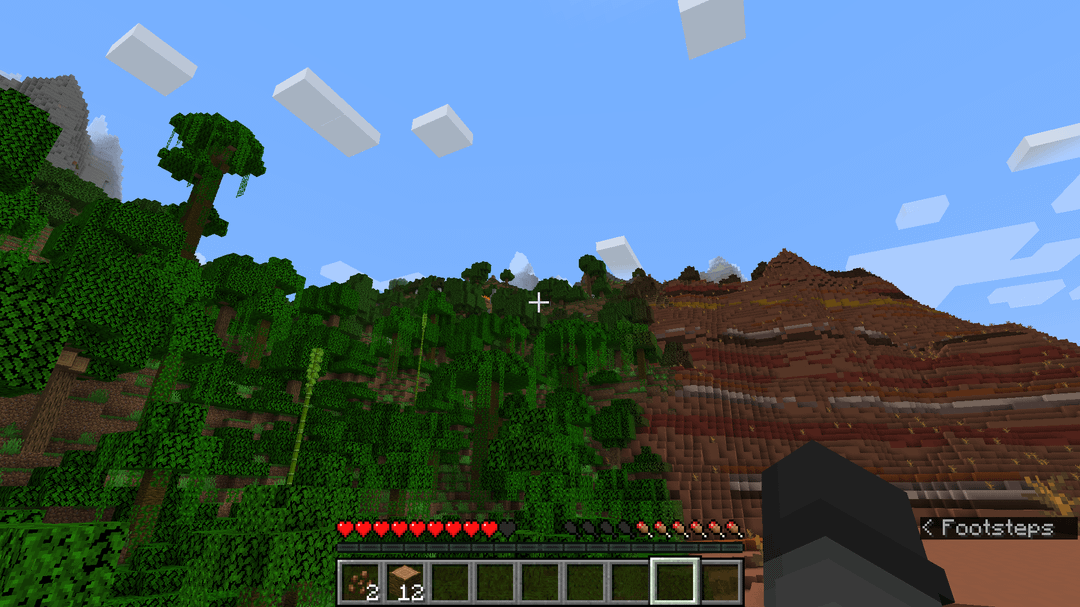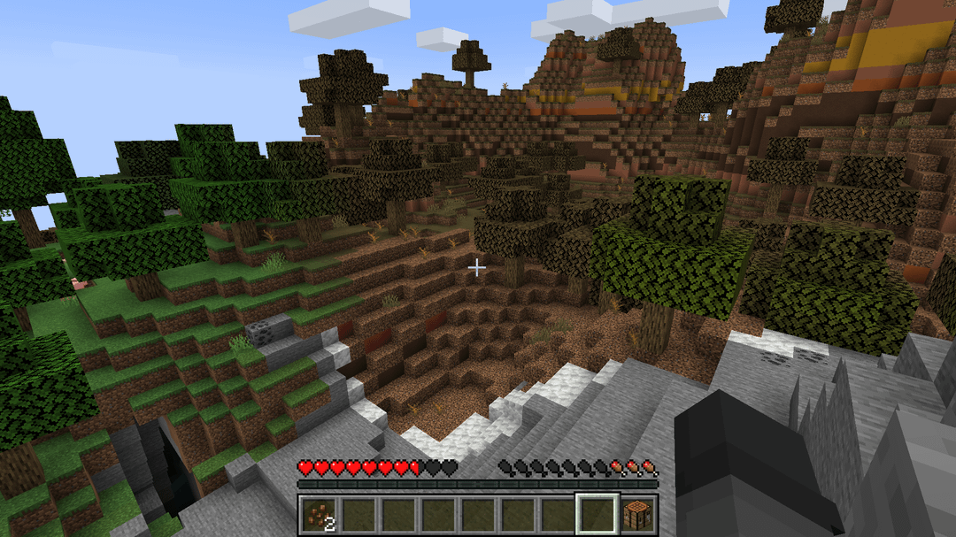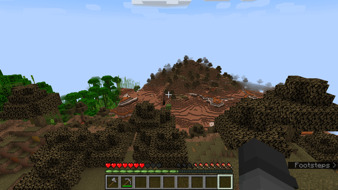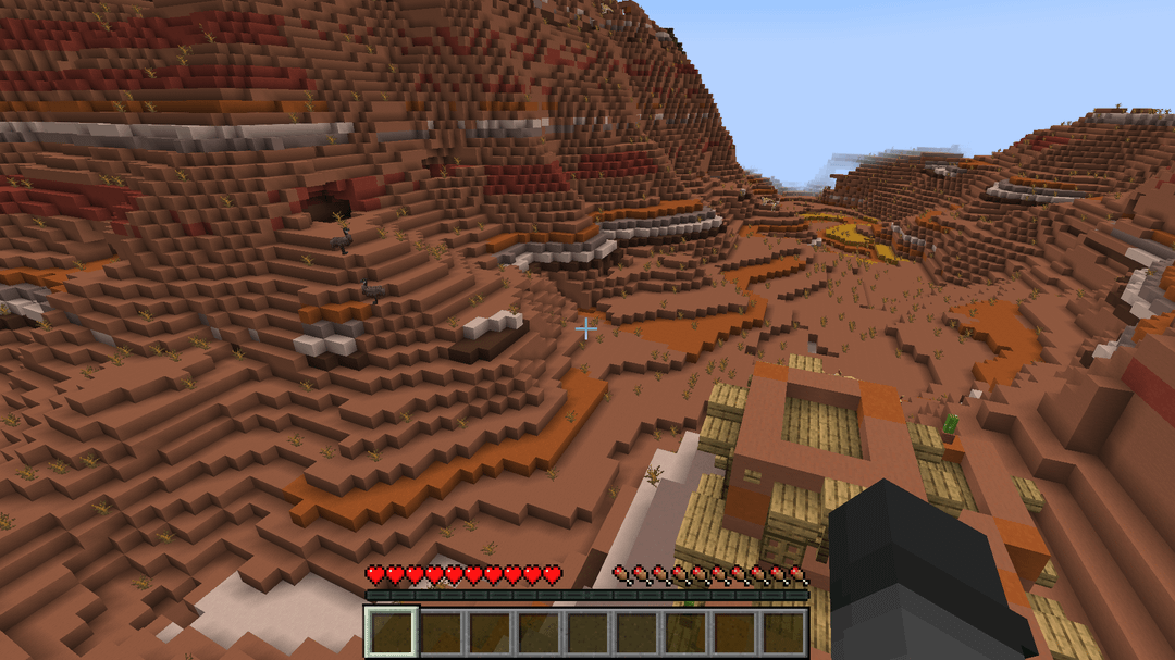 you spawn in a mesa biome, that's form a canyon, and there's a moutain, with a lot of iron, i got 3 packs of iron in that mountain and a lot of emerald, if you follow the mesa, you can find a lake, with a dungeon, connected to a mine, you can found a jungle, and bamboos too