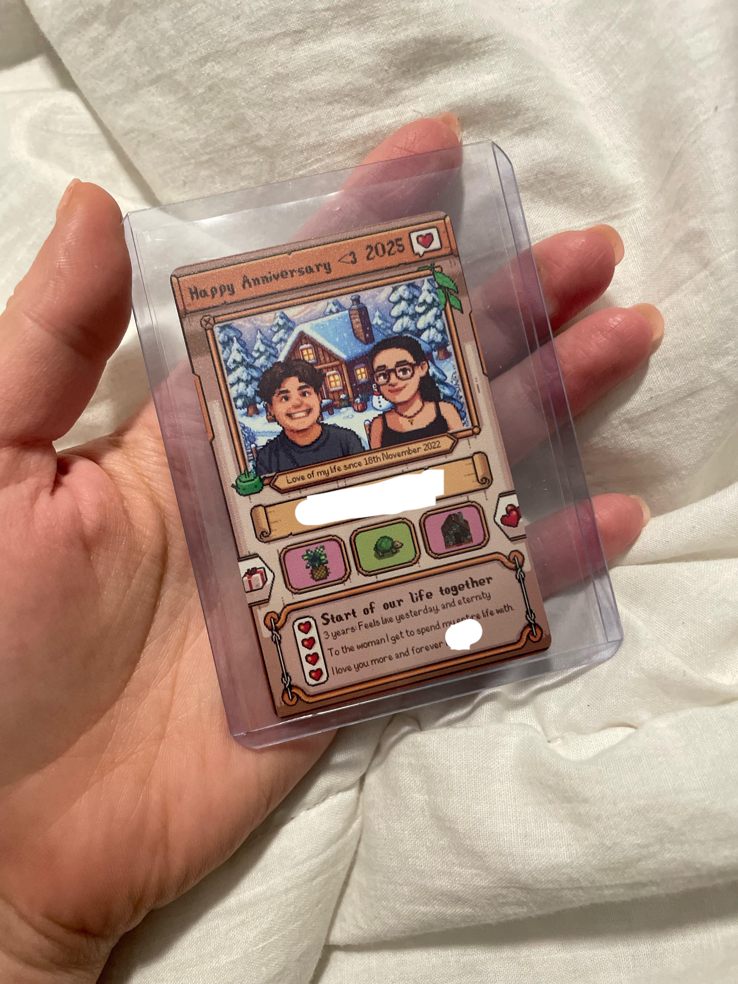 my sweet sweet fiancé and I just celebrated our 3 year anniversary. stardew has absolutely taken over my life the last year after being someone who didn’t really have games i enjoyed and he’s gotten to watch me go pretty much insane over the lore and mods and core game (much less the crash out when I found out symphony was in my town but I didn’t know about it). we went to exchange gifts and he puts this tiny little card in my hand that means absolutely everything to me. he’d gotten a store he found online to custom make both pixel art of us and writing and symbols that represent us (eg we love turtles!). it is genuinely the sweetest thing I could ever have asked for and I know most people wouldn’t understand but it melts my heart everytime I think about it.
