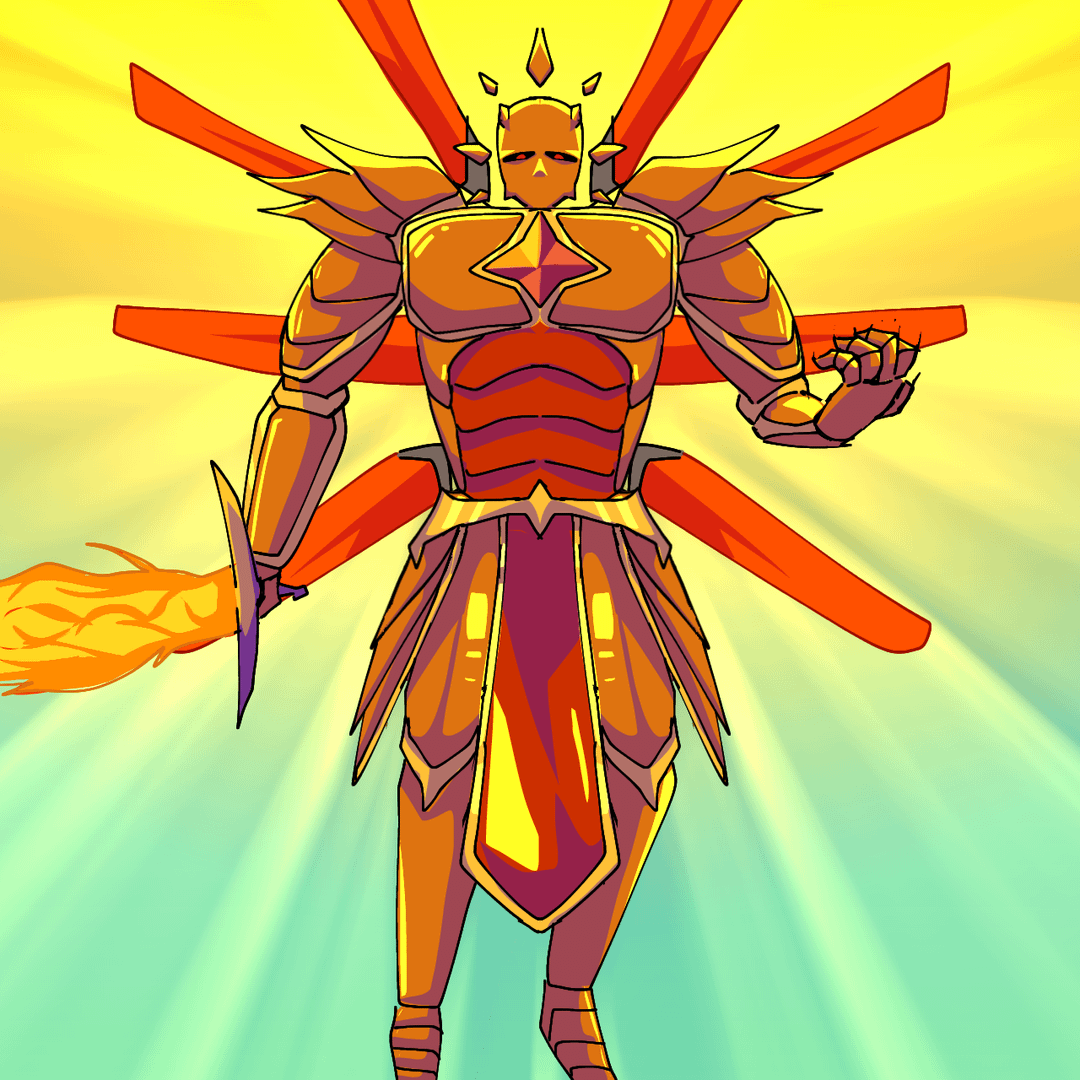 his name is 'burnard' (cause he burns things) and his title is "the false sun god". yes it's a little edgy but I just find his design imo to be just badass.
