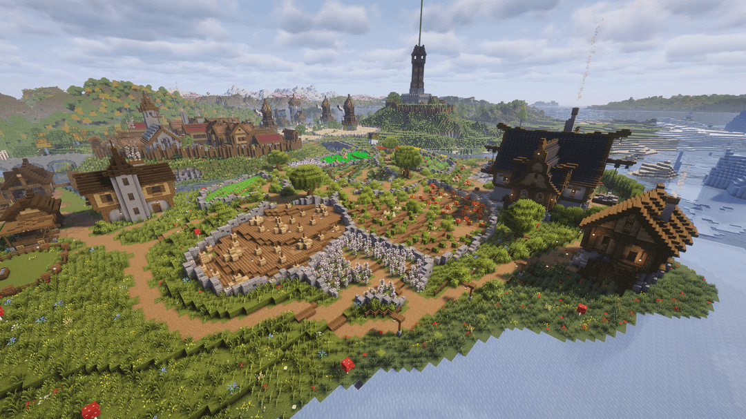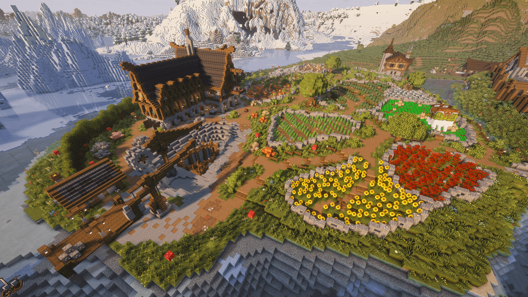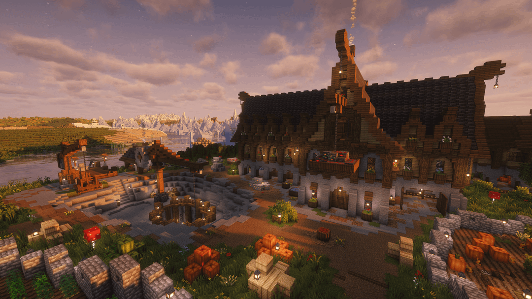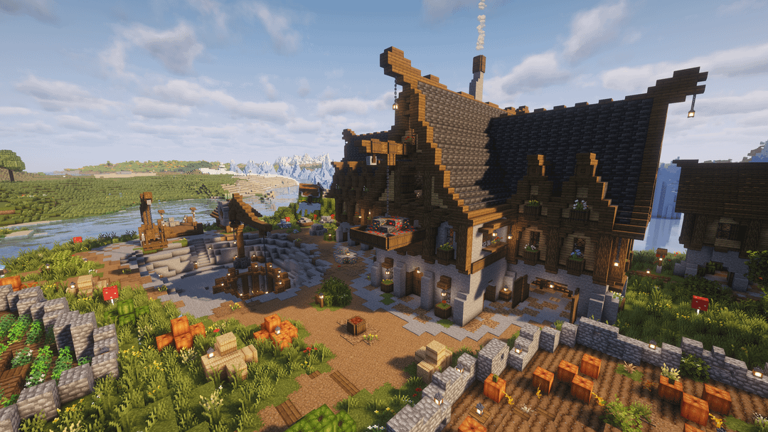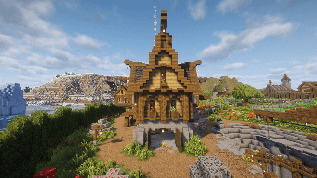 Today I finally finished my mining/farm district on the south side of my map (after around 250days). It all started with the need of a warehouse for the fieldproducts which then exploded in size. My happy little accident then turned into what you see in the screenshot. Credit goes to https://www.instagram.com/p/Cj7nHzjLpC6/ and https://www.youtube.com/watch?v=oKhT17pkmh0 for the inspiration. All the buildings have full interior. You can also see my first attempt at a diagonal house. In the end I added custom trees and bone mealed the ground. I hope you get inspiration for your own builds and stay creative :). A list of my resource pack/mods can be found in the comments