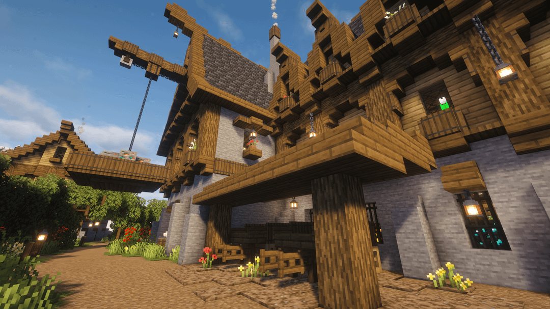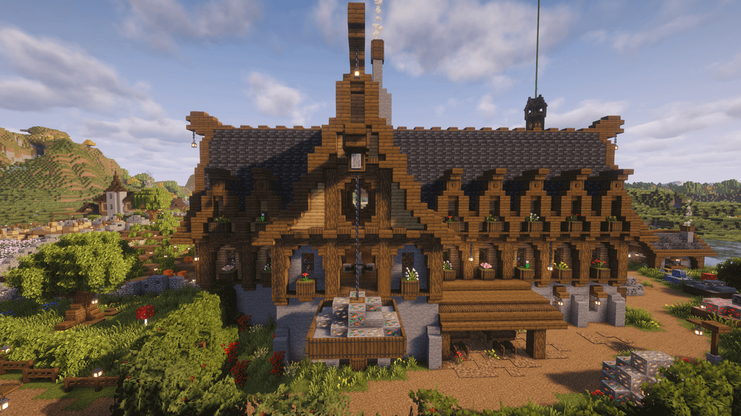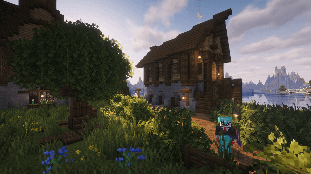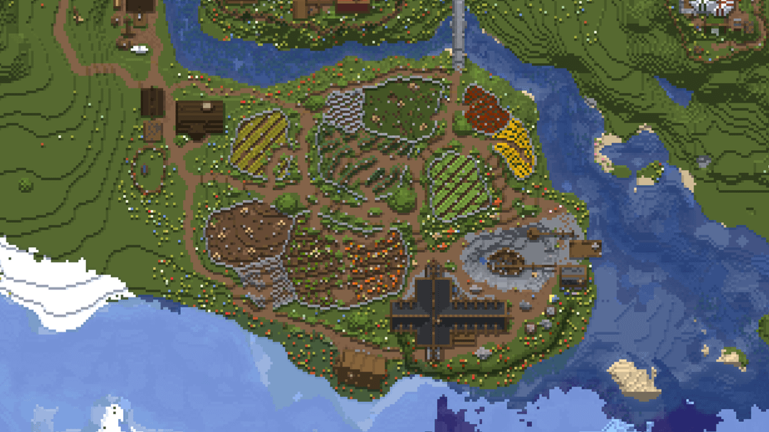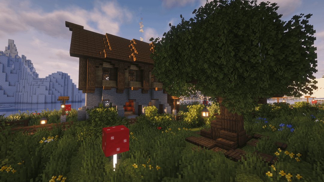 Today I finally finished my mining/farm district on the south side of my map (after around 250days). It all started with the need of a warehouse for the fieldproducts which then exploded in size. My happy little accident then turned into what you see in the screenshot. Credit goes to https://www.instagram.com/p/Cj7nHzjLpC6/ and https://www.youtube.com/watch?v=oKhT17pkmh0 for the inspiration. All the buildings have full interior. You can also see my first attempt at a diagonal house. In the end I added custom trees and bone mealed the ground. I hope you get inspiration for your own builds and stay creative :). A list of my resource pack/mods can be found in the comments