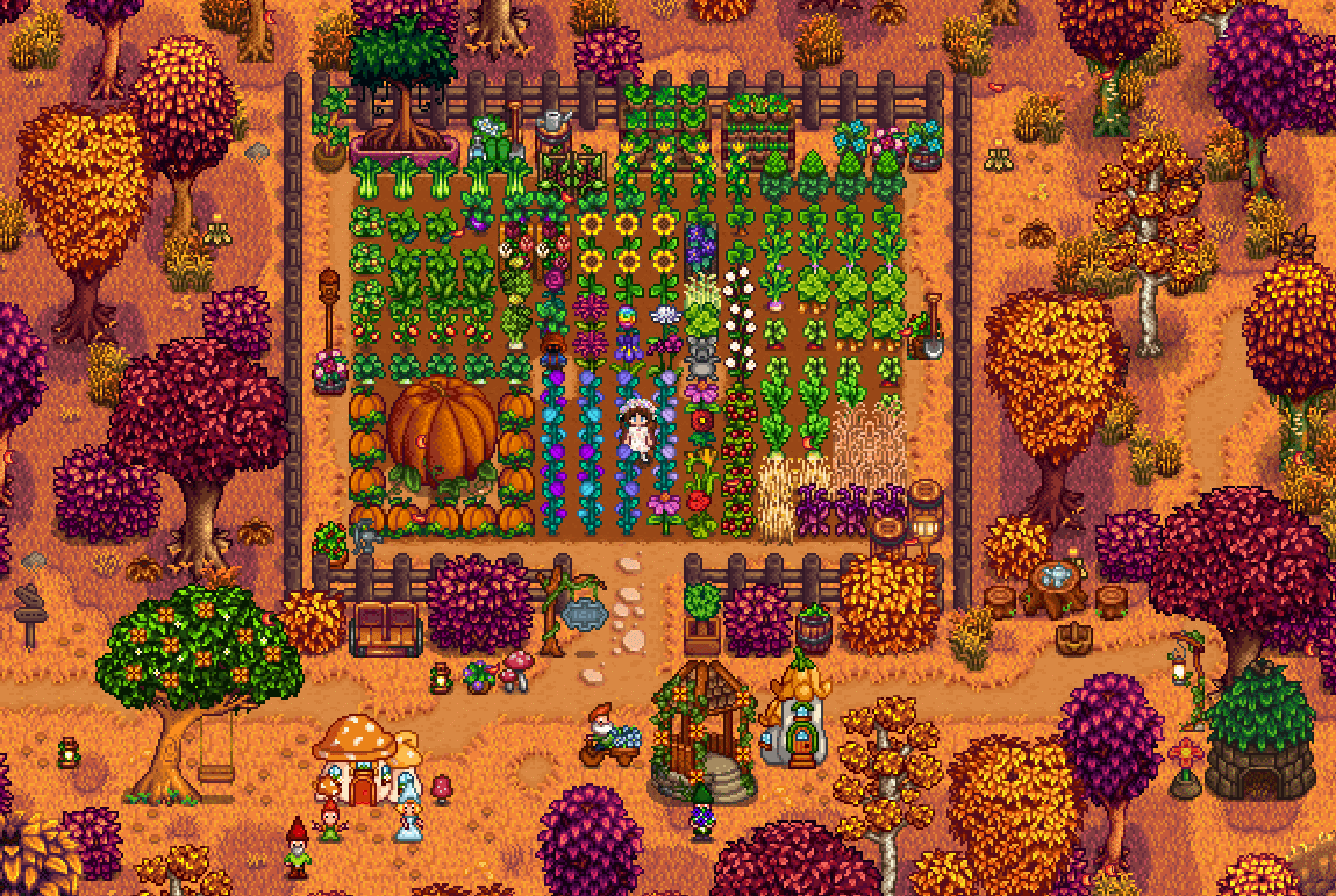 I try to plant a vareity of crops to showcase Stardew awesomeness, as if Martha Stewart is gonna come here to view it. I got super lucky to have my pumpkins be mega huge. Hope ya'll like itš©· by Ok_Finish_2684 Stardew Valley