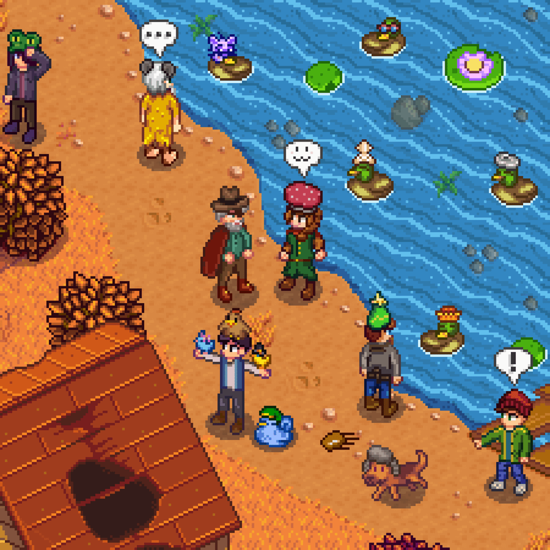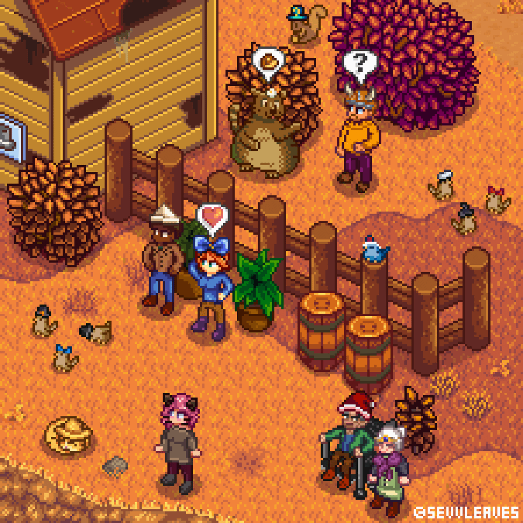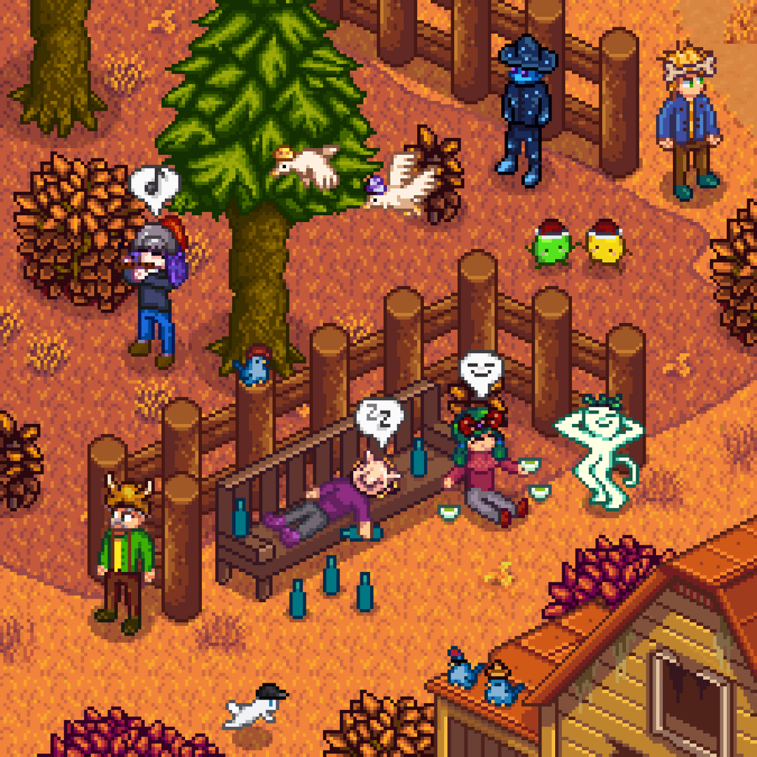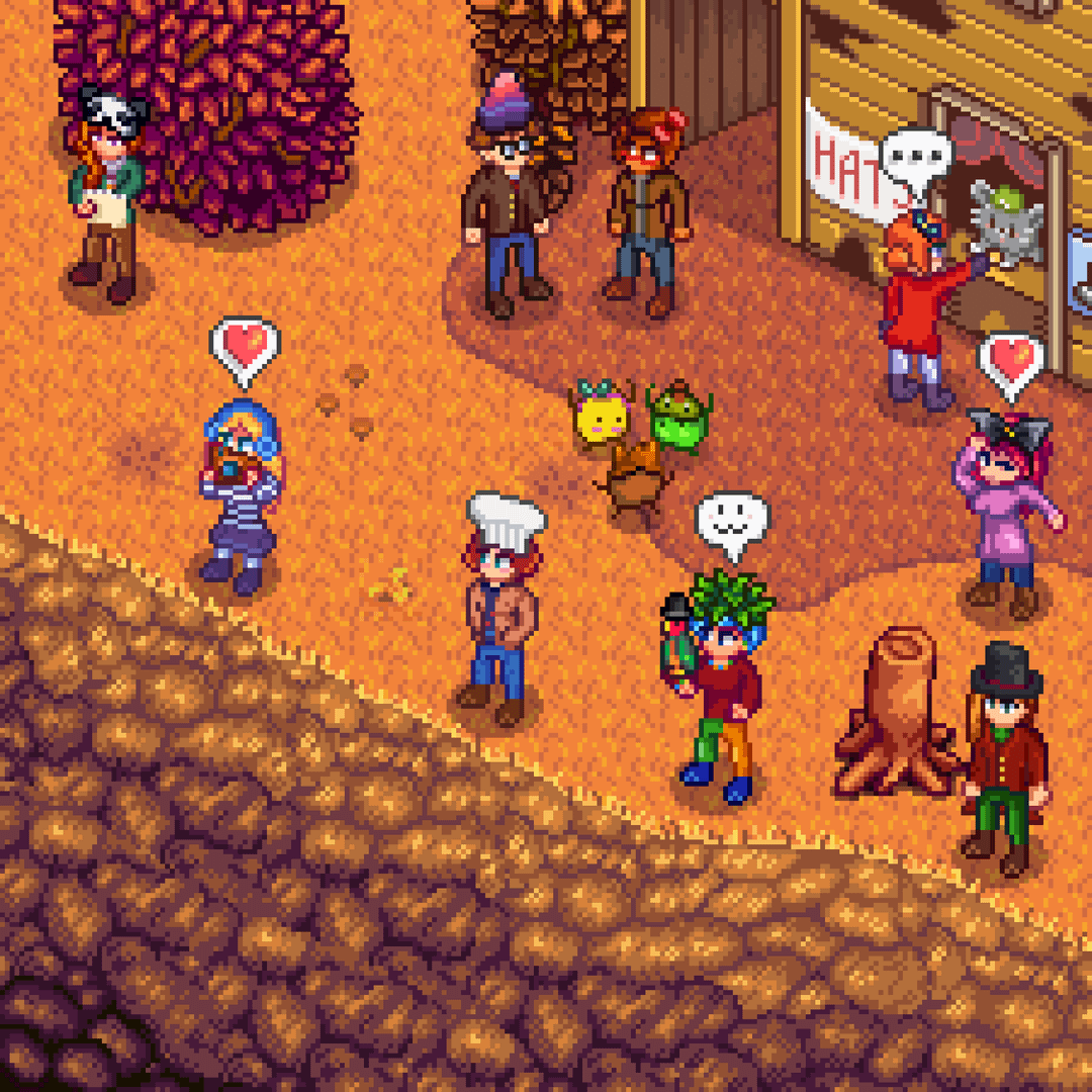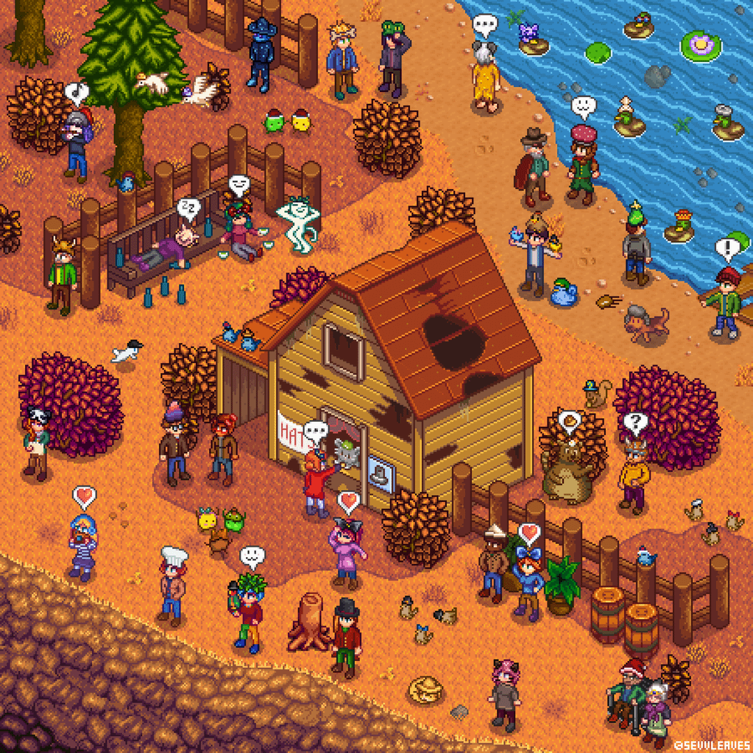 Everyone wearing hats!! Hello everyone, this could easily be an in-game event where everyone gathers to wear hats… after all, the hat shop is kind of forgotten in the game🎩 by sevvleaves Stardew Valley