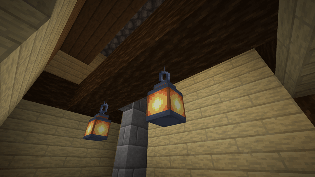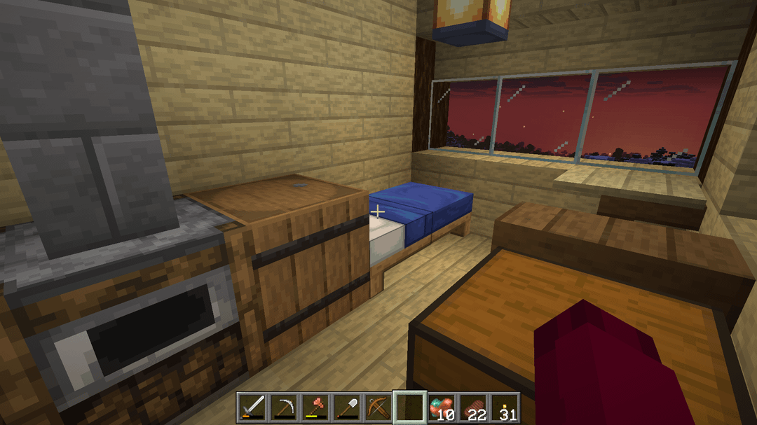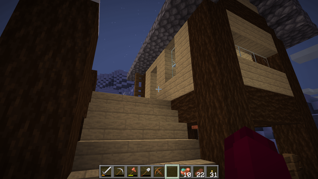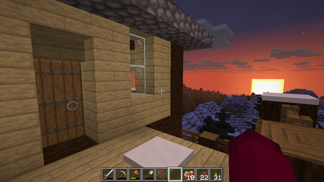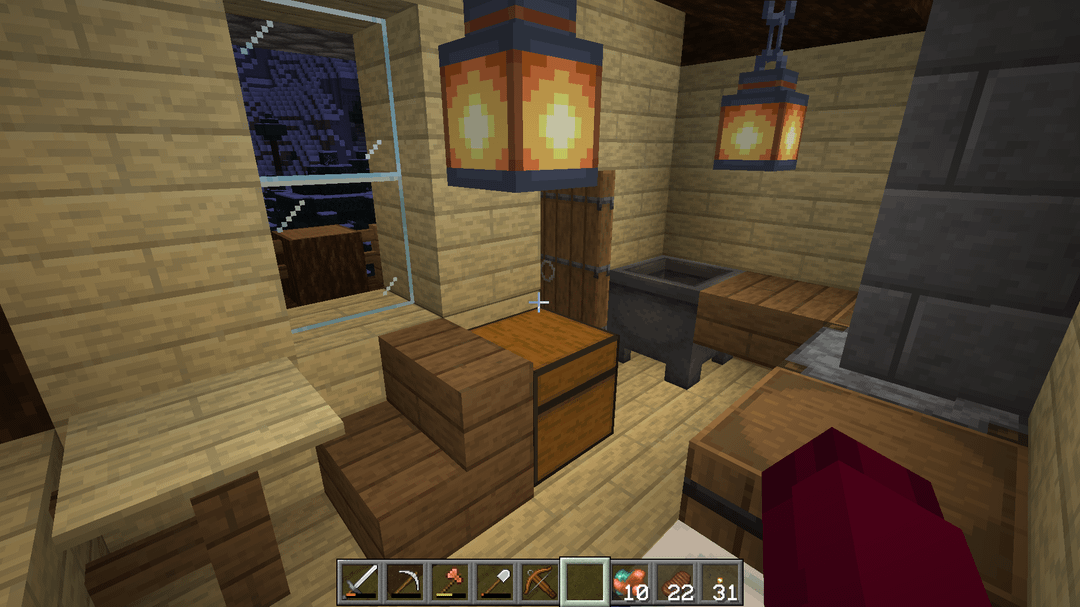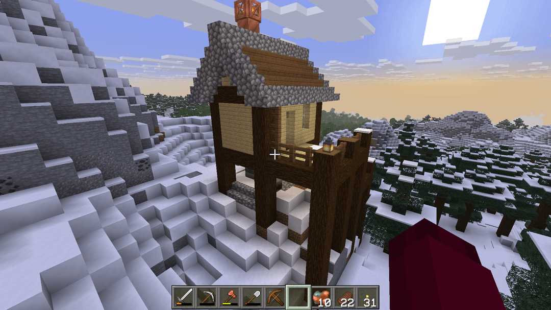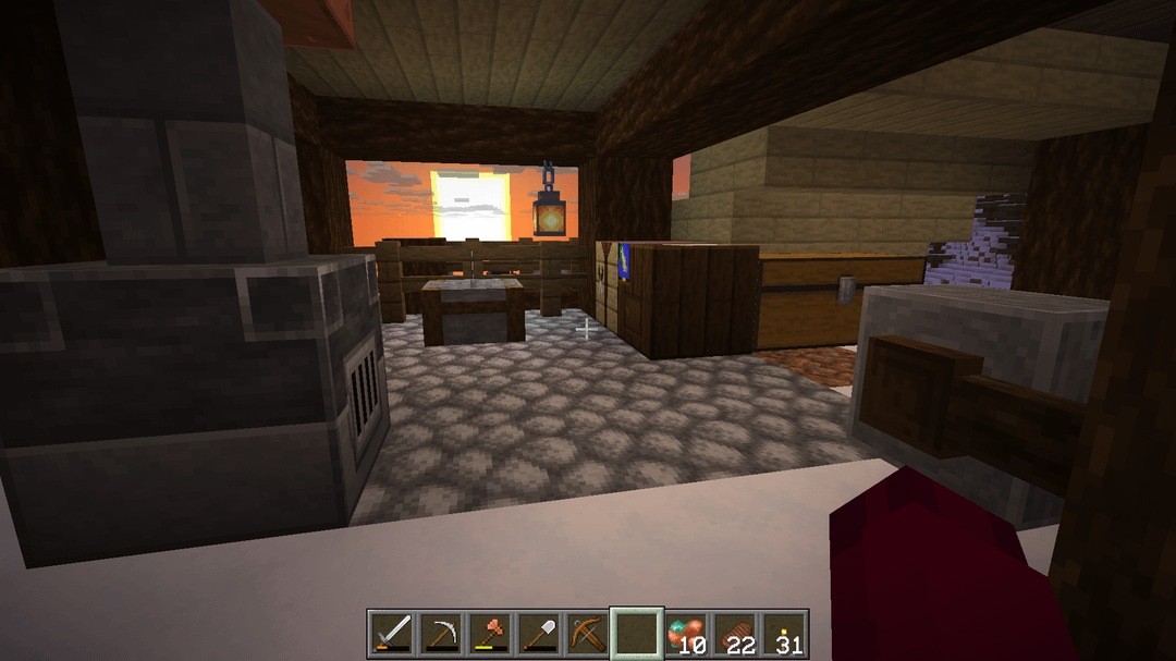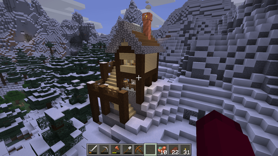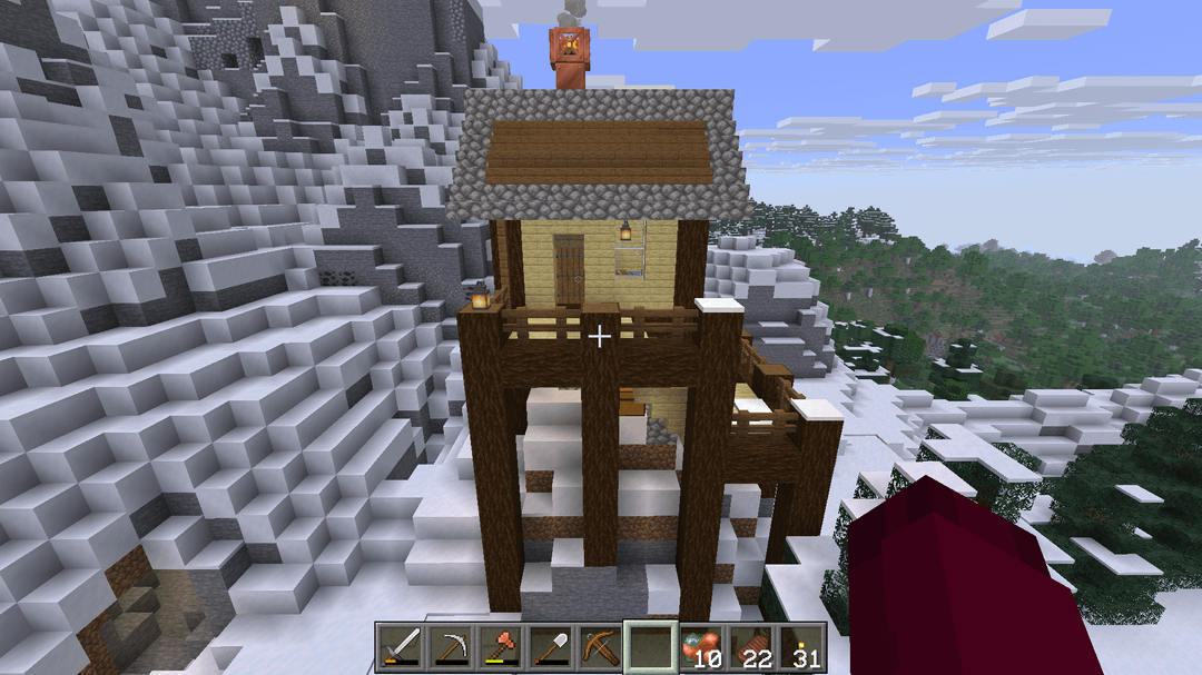 My alteration mainly cinsist of extending the stairs around the corner to account for the build location, and replacing the crop space underneath the house with a workshop area. Added a few other things for aesthetics, like the chimney, ceiling beam with lanterns, and the different window layout.