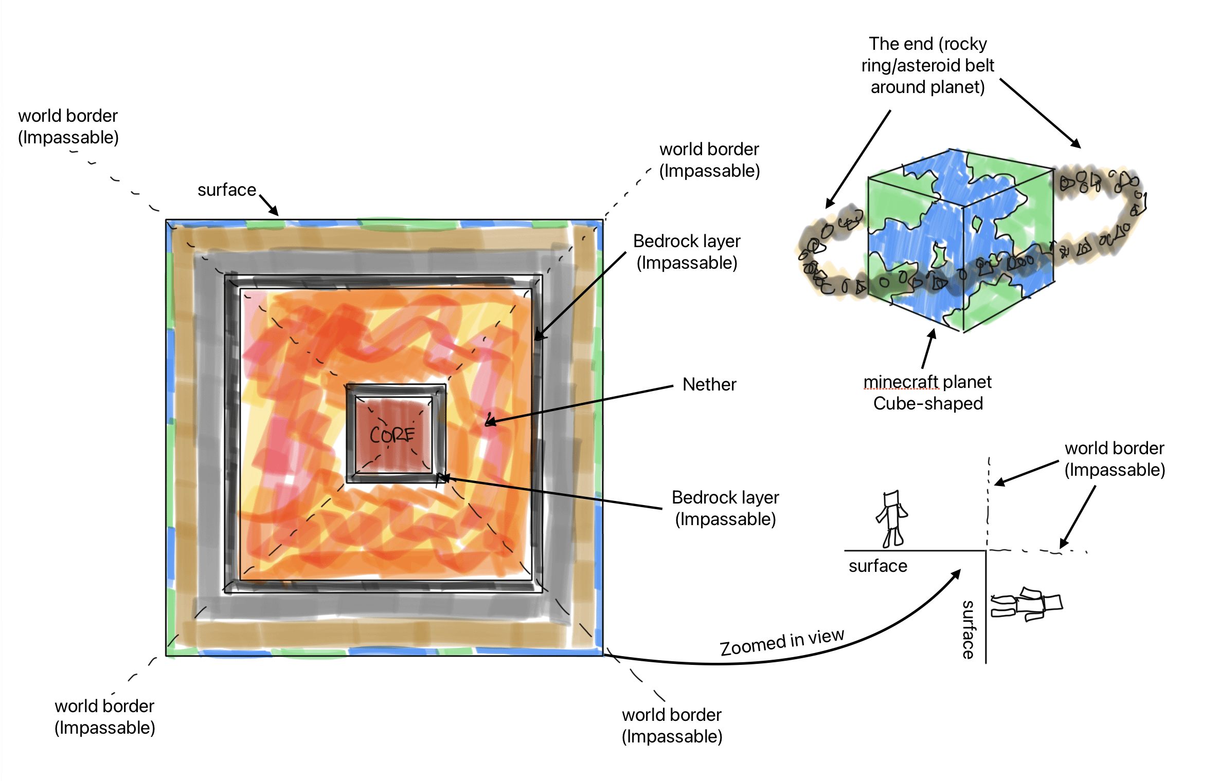 How gravity would work on a cube world would mean the further away from the center the weaker gravity would be and the corners would abe really low gravity on a cube world.