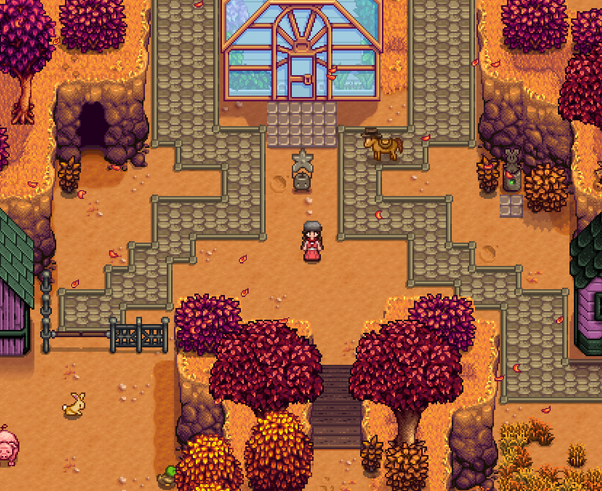 I like this farm because I can put my animals in one corner, farm in another, and my storage in the third. BUT unfortunately, I have to live with the greenhouse not matching up with the pathway. It annoys me so much.