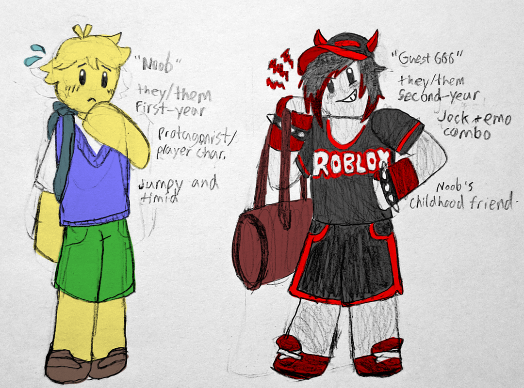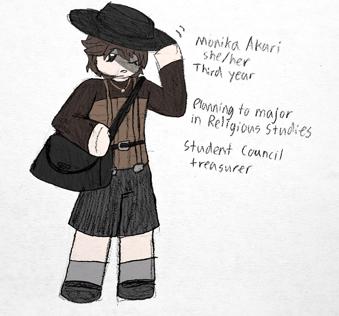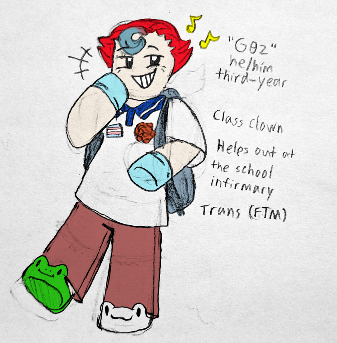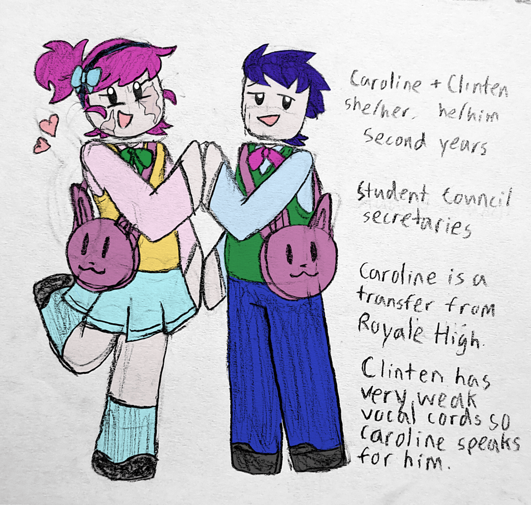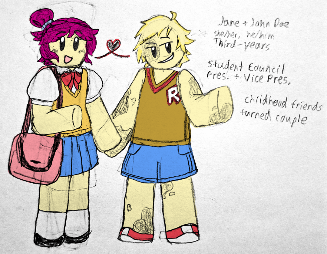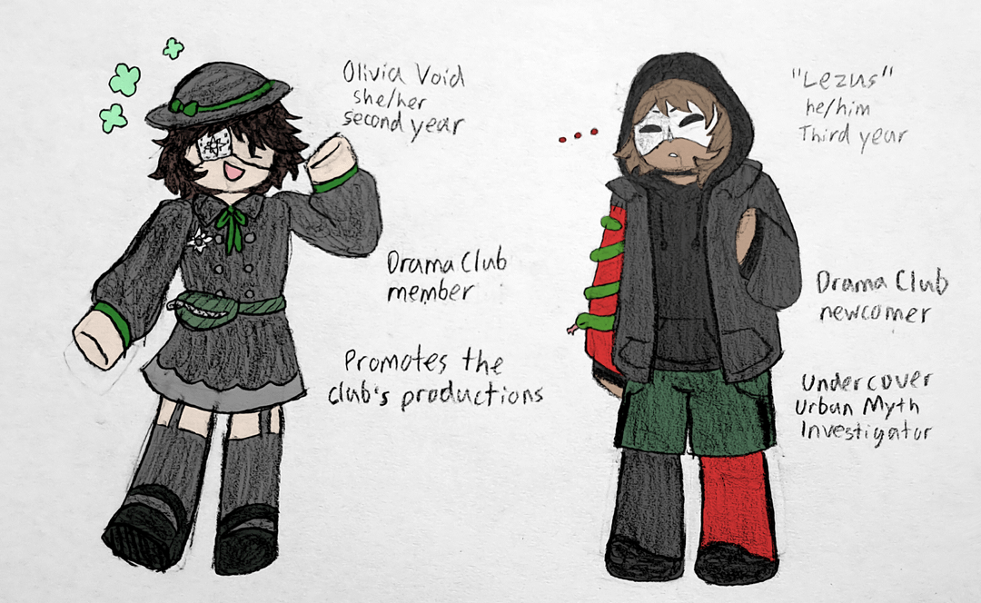 over the past three weeks or so I drew concept art for a roblox high-school-type visual novel based around myths and legends in the community (i did not know which flair to put this under)