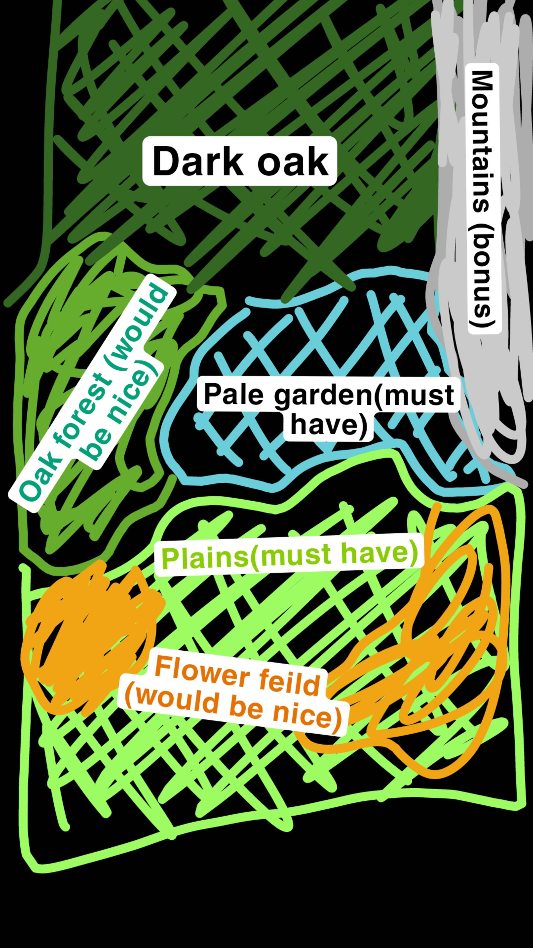 The mountains can be anywhere or nowhere, they aren't important, same with the oak becasue i can basically plant what i want. The plains could be all flower feild or there could be no flower fields, what's important is that there's some variation of open feild next to a pale garden. This might be more possible on a large Mountain plateau and just terraforming and planting it, but I'd love a plains biome connection to be possible.