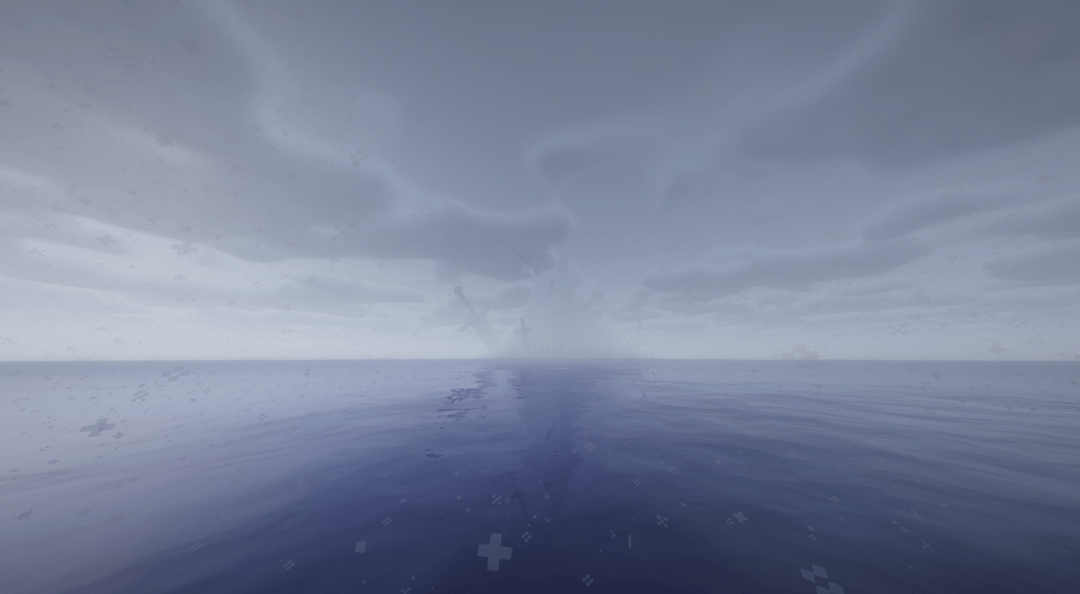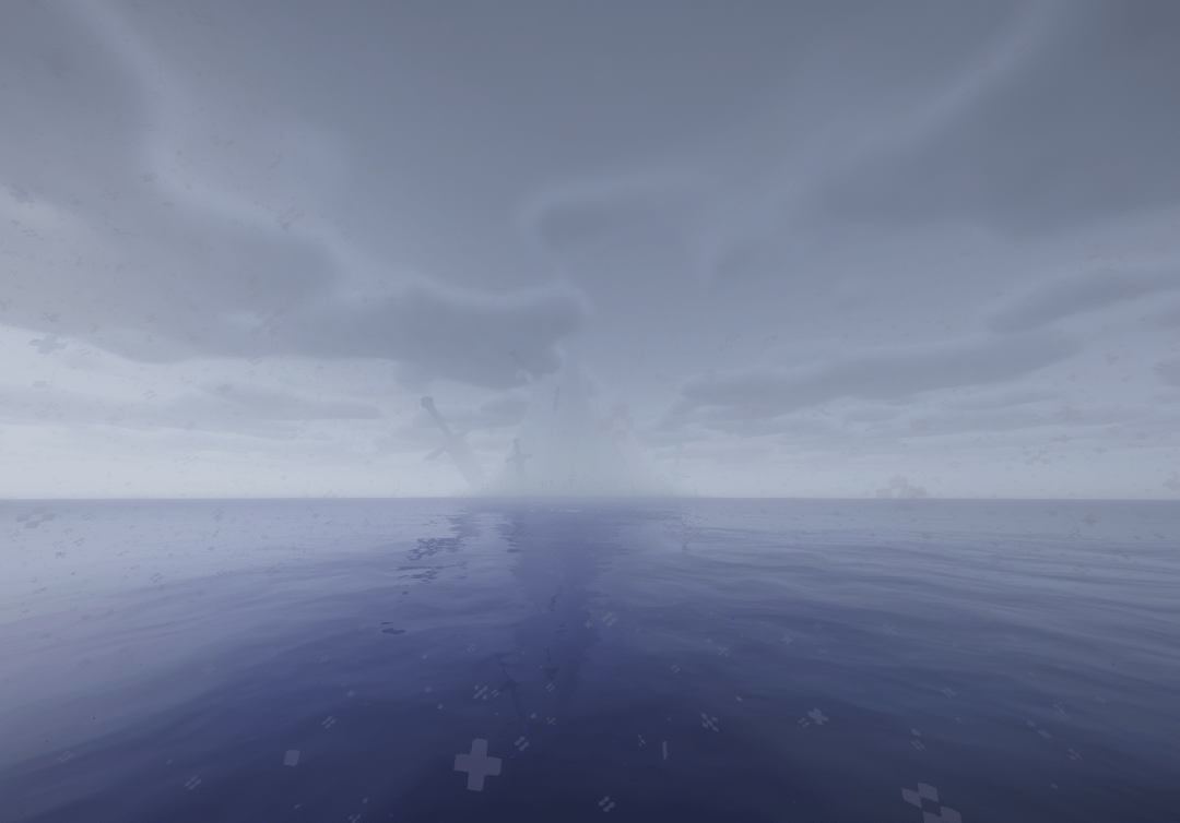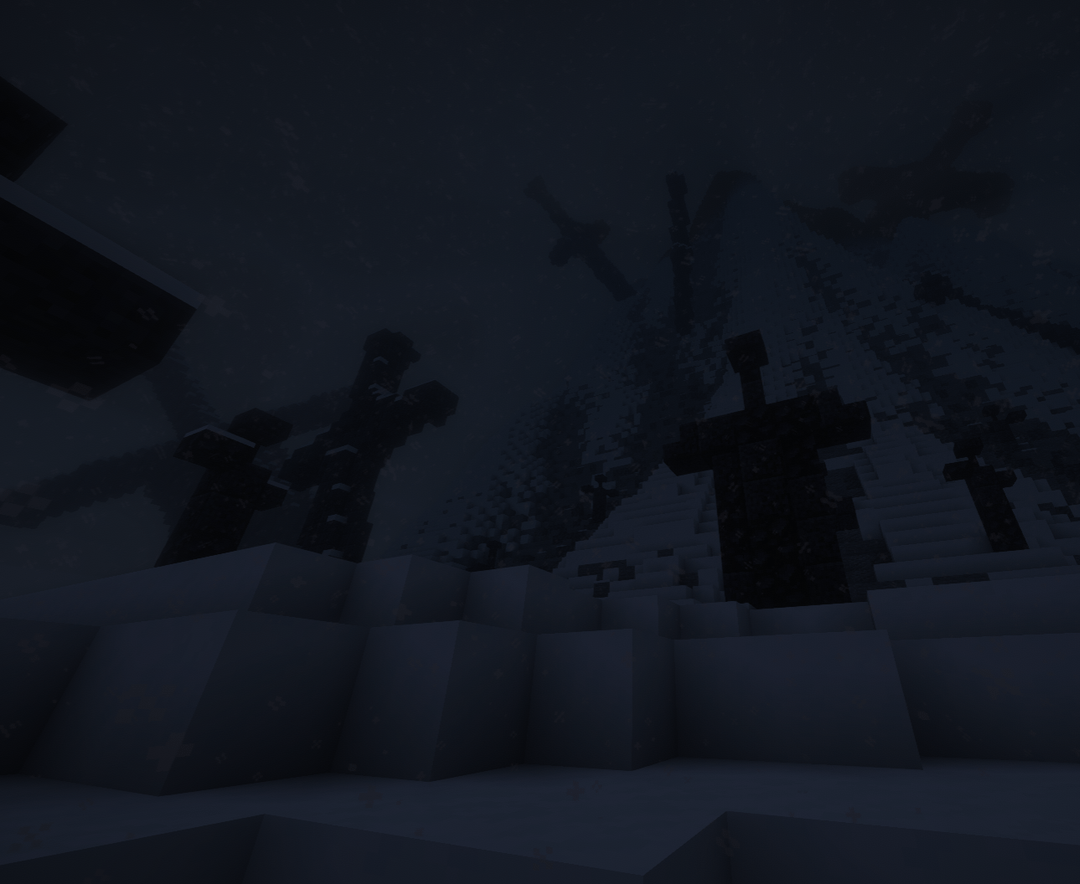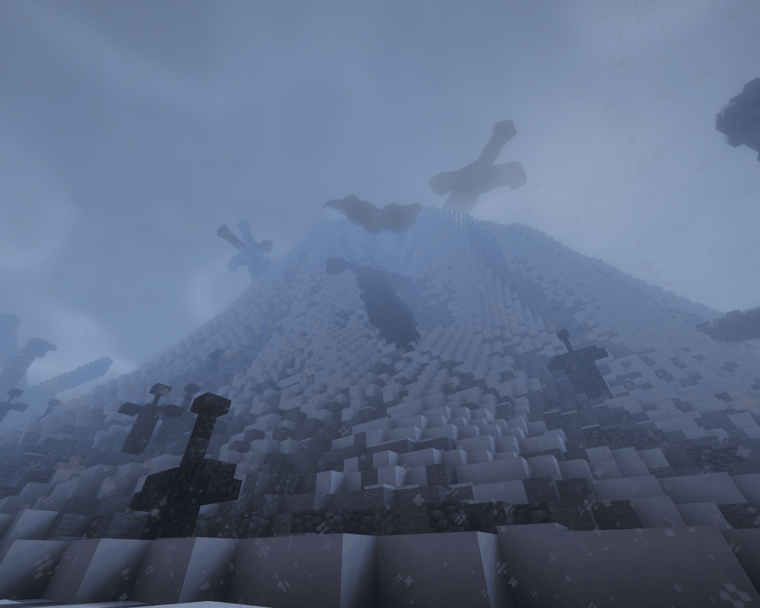 Upon the island, there are two distinctly large pieces of iron. The first, stuck high in the peak, held a pommel curved at each end of the crossguard and a pommel that flared to a flat base. It had been long since we could see it through the clouds, and it's a trek of verticality I, nor any future explorer, would dare tread.