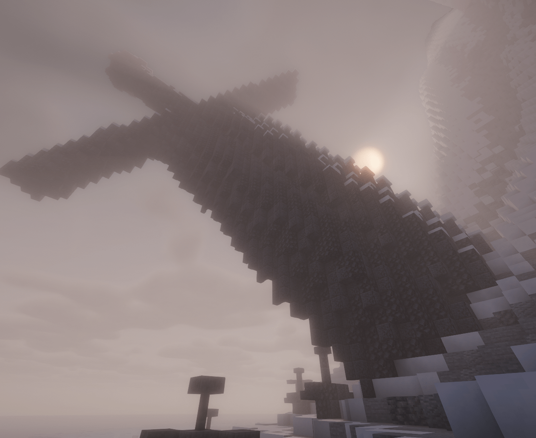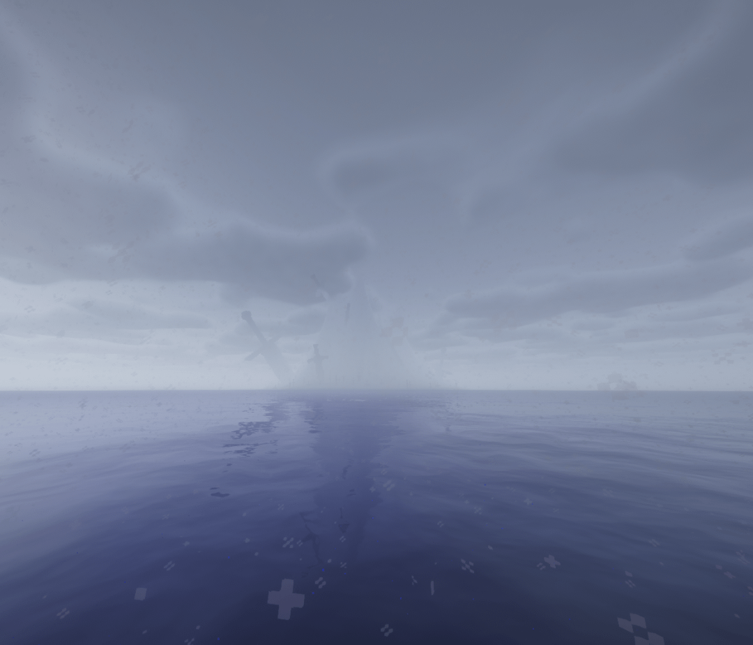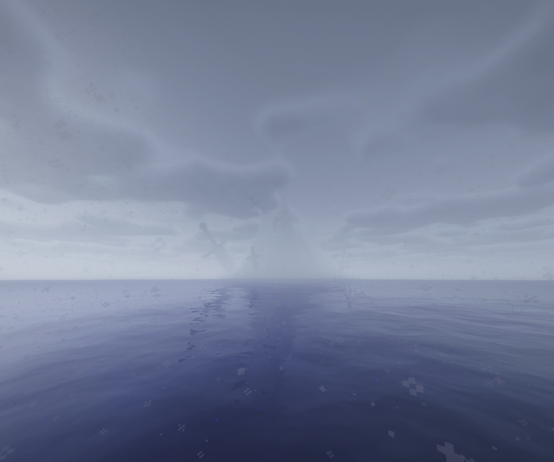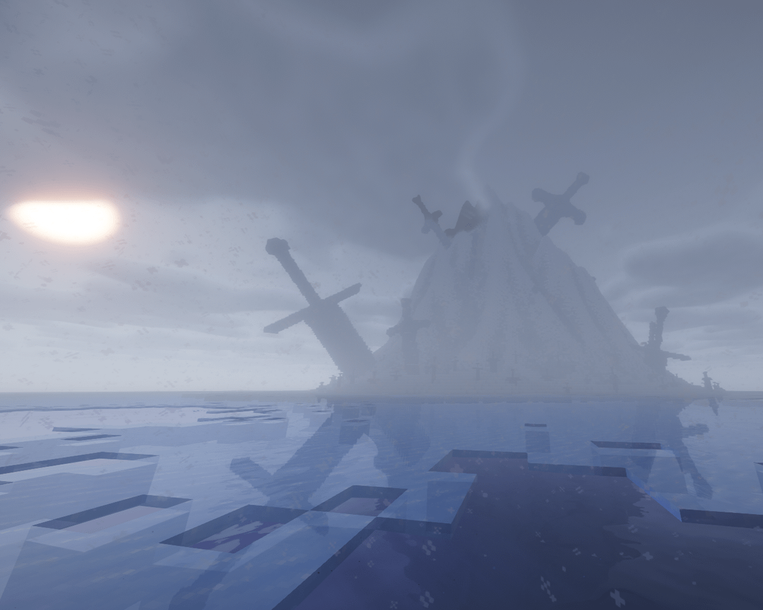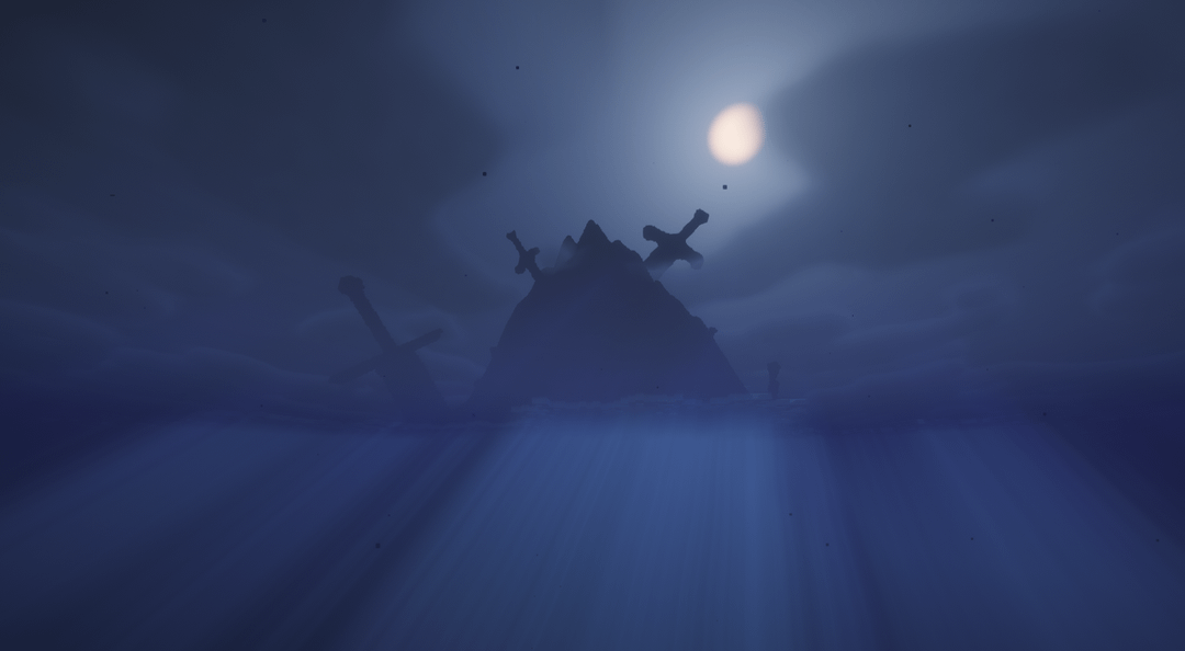 Upon the island, there are two distinctly large pieces of iron. The first, stuck high in the peak, held a pommel curved at each end of the crossguard and a pommel that flared to a flat base. It had been long since we could see it through the clouds, and it's a trek of verticality I, nor any future explorer, would dare tread.