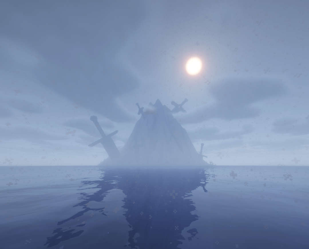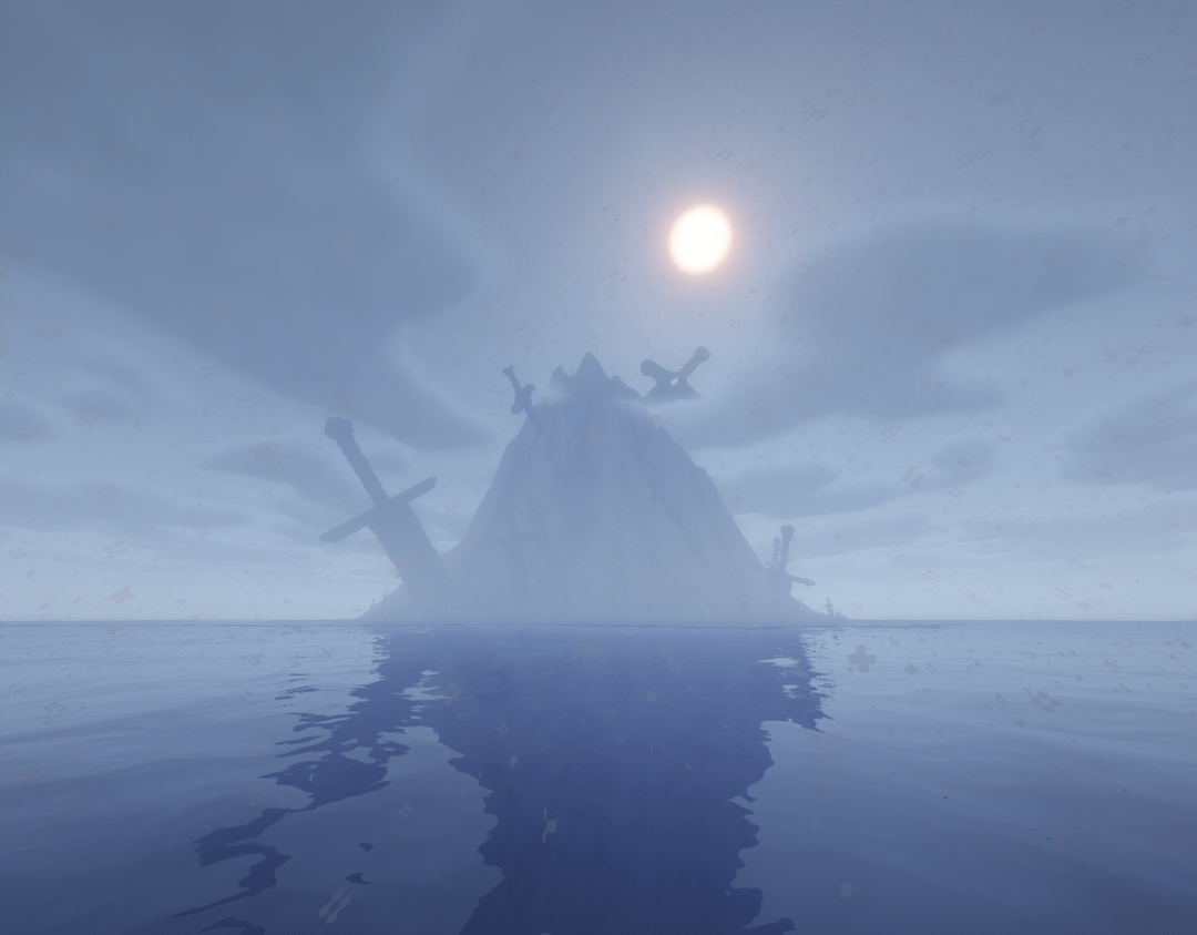 Upon that island lies swords, thousands upon thousands of rusted blades stabbed into the rocky spire, some of which appear as greenery from a great distance. (Though whether there is real flora on the island or not, is yet to be verified). The swords, by themselves, are a casual oddity explained by a scuffle of tribesman or an abandoned encampment hosting an unfortunate battalion.