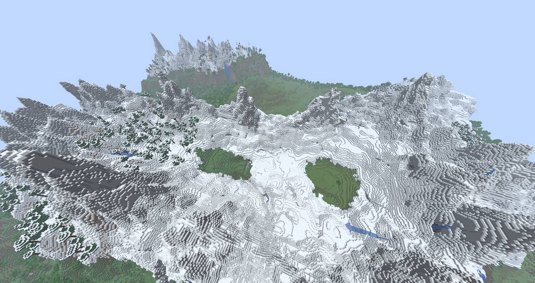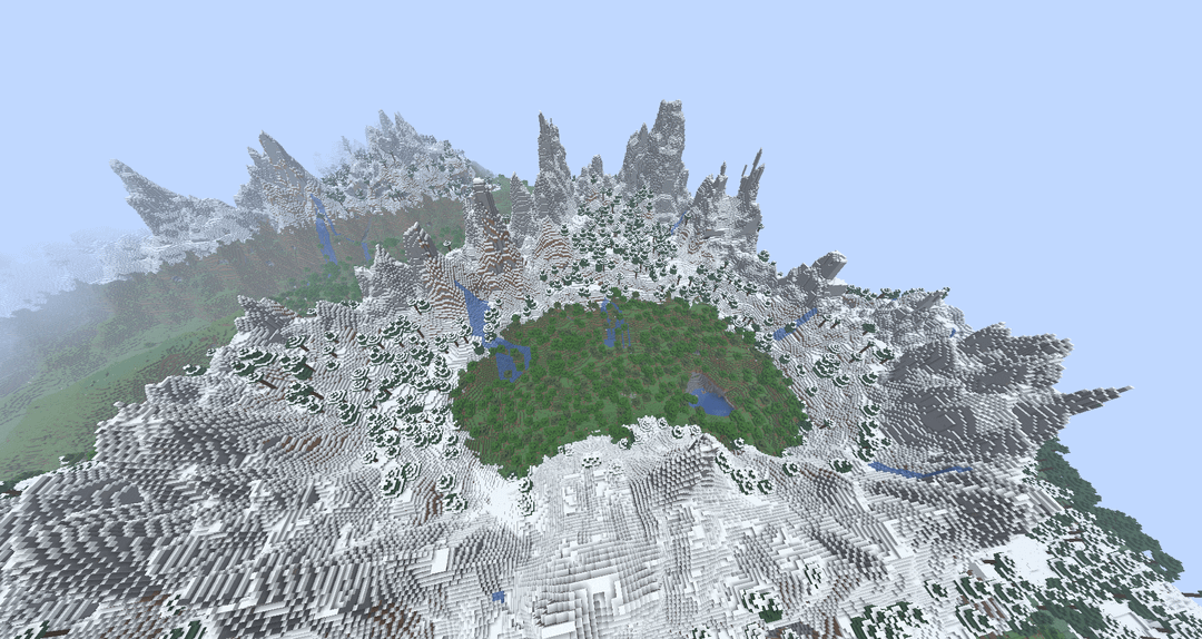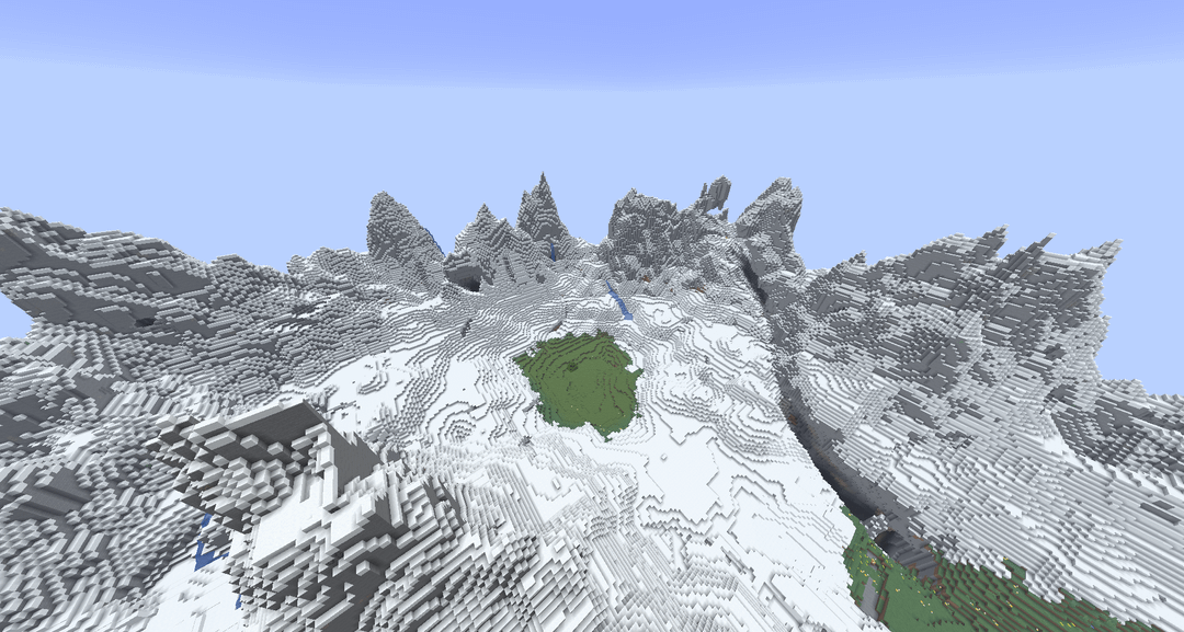 I found two enclosed, circular mountain areas in snowy biomes, each with a patch of green grass right in the center. They're perfect for building a cozy base in your survival world.