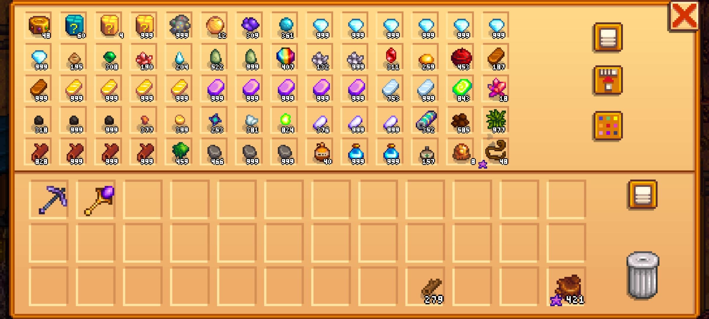 I cloned the diamonds in the crystal stores, I farmed a little Iridium bars, but there are so few of them that I honestly got tired of doing that, Iridium is easier with bombs, stone ladders and lucky food, the prismatic crystals are the combination of the six years I never sold a single one of which I started the game and the rest of the time I spent fishing, something I like to do.