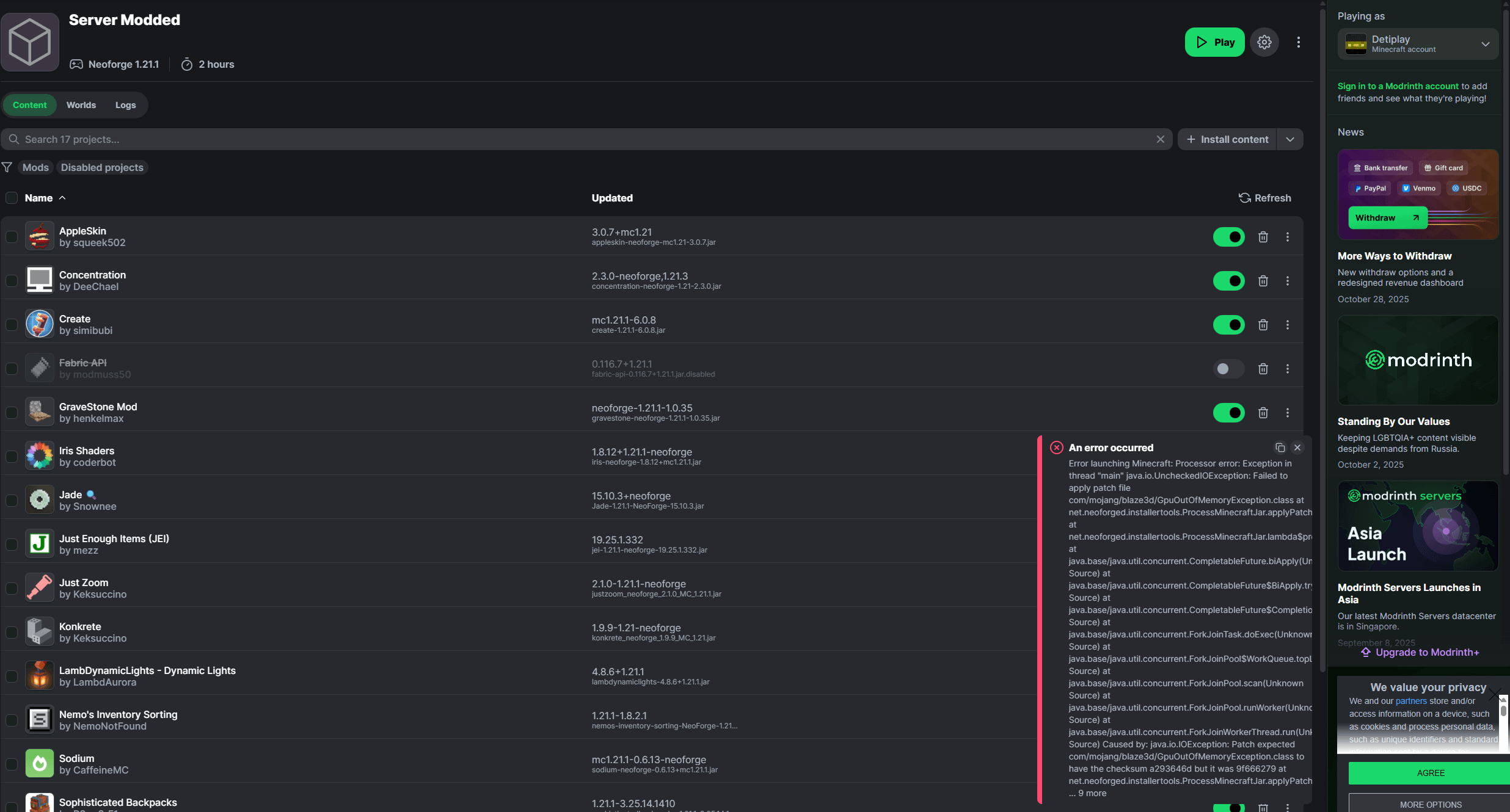 Error launching Minecraft: Processor error: Exception in thread "main" java.io.UncheckedIOException: Failed to apply patch file com/mojang/blaze3d/GpuOutOfMemoryException.class