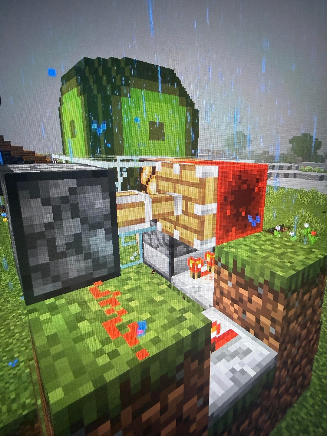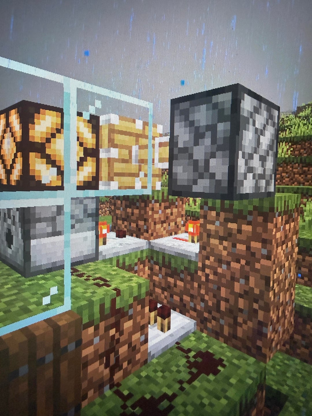 LucidRedtone on December 4, 2025 7:45 pm Put a block on the back of the light where the redstone block is, put dust on the dirt the comparator reading the dispenser is powering. The comparator will power the dust> dust powers the light trough the block.