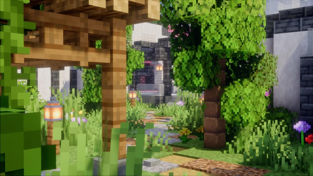 Villager trading hall with two connected buildings. 120 Villagers, lush courtyards, and a beacon to top it off. by NightmaredGaming123 Minecraft Minecraft Builds