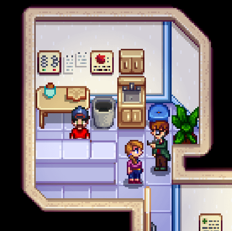 I went to give Harvey a bouquet and he was about to begin Jodi's exam. I tried to be quick, but they boxed me in! Jodi was not happy. by NotTheBicycle Stardew Valley