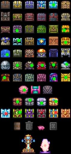 I've been working on a 'Trophy World,' and one of the things in it is a big room with all the stuff from every boss. I've got a good chunk of them down, but I still need some chests for a few of the bosses. Green dots are used chests, red dots are ones I still need to get, but plan to use. The bosses and their chests are as follows: