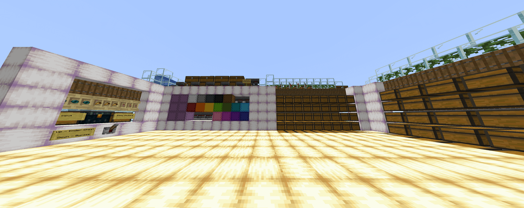 1 – Overview of storage system showing item drop off, ender chest wall, and copper golem multi-item sorter.