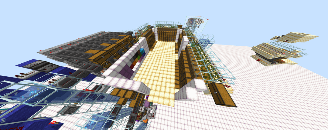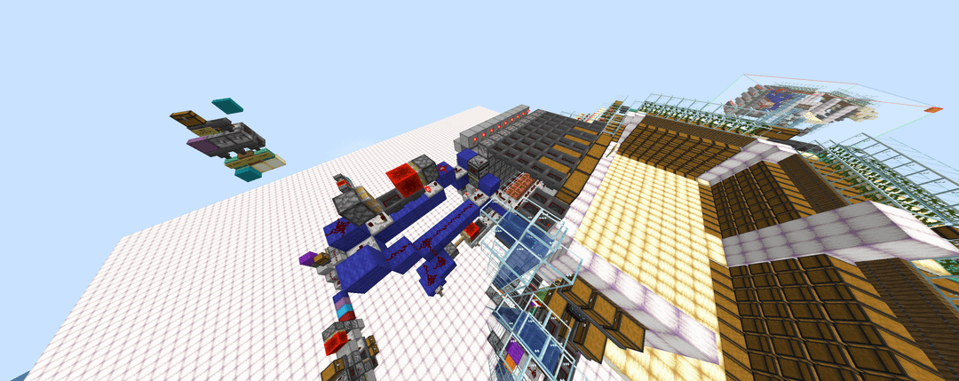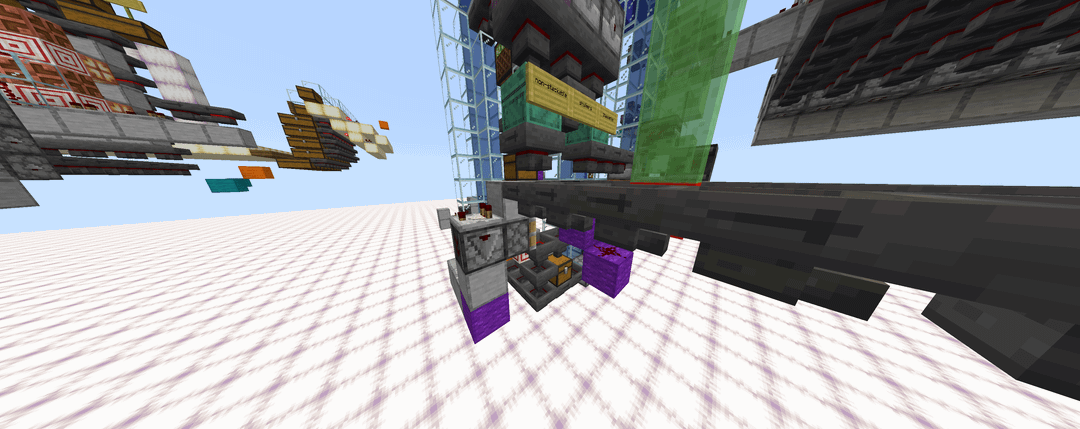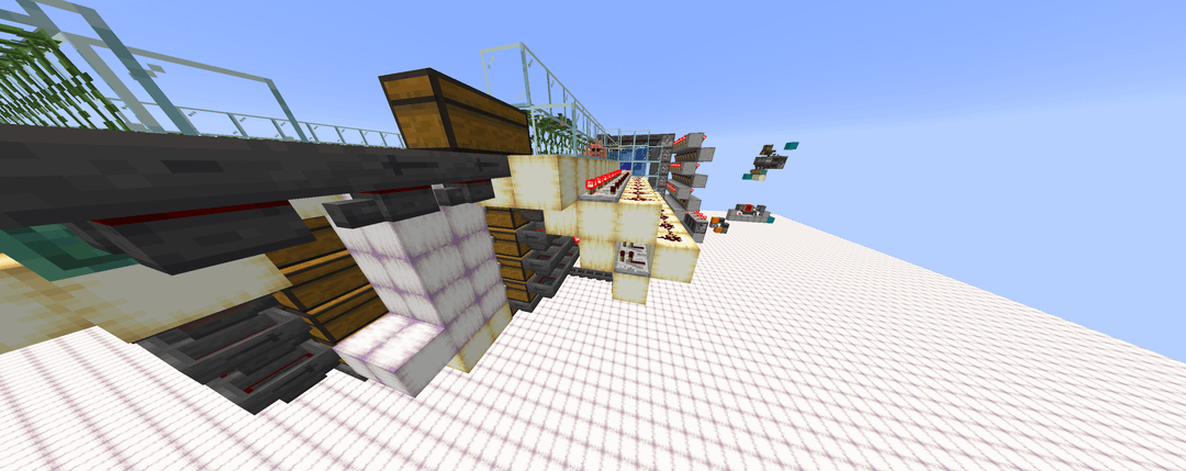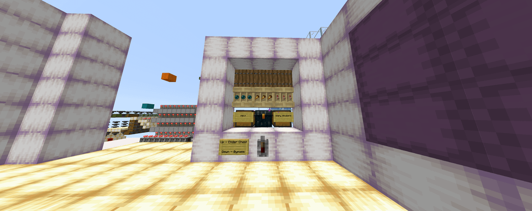 4 – The stackable items are sent up a bubblevator and through a series of hoppers that try to insert into the wall of enderchest shulker boxes. A pulse extender is used so that the item-cycling clock stays on long enough for the last entering item to make it through all of the enderchest shulker boxes.