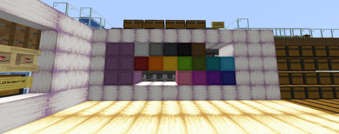 8 – The enderchest shulker box wall. Just placeholders in this design, but would follow your system for color-coding enderchest boxes. I don't usually have my enderchest completely full, so I would just remove a few from the wall in my world.