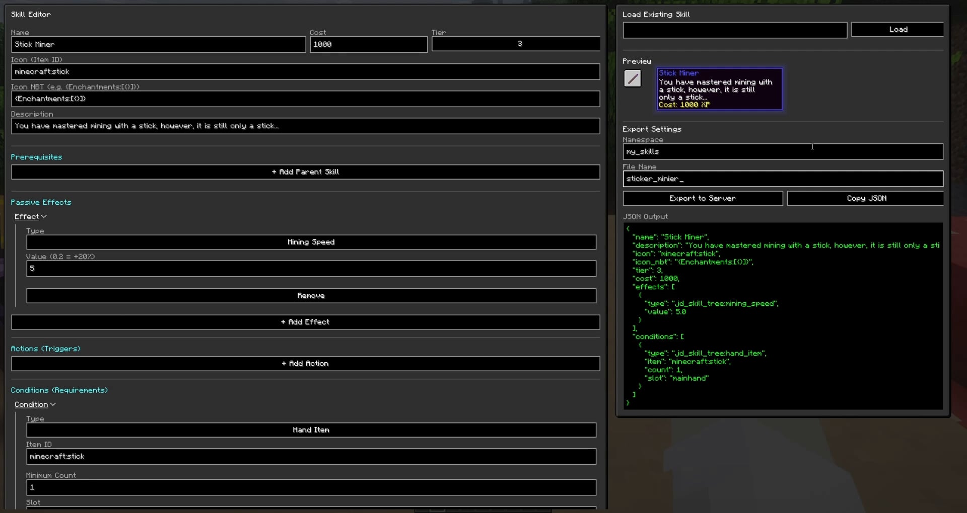 After showing them the built-in editor, they all independently figured out how to create their own skills. And I mean skills with real complexity things that meaningfully change how the game is played. That got me thinking: surely a tool like this already exists for datapack creation. There is Misode’s site (https://misode.github.io/), which I’ve used more than I’d like to admit, but for players who don’t want to learn the precise placement of every file in a datapack, a built-in visual editor would be a worthwhile feature.
