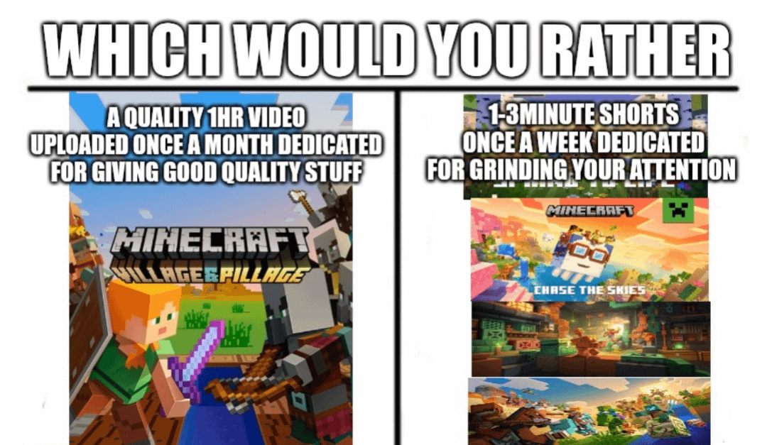 Personally I prefer a mix of both, there’s not much left in the game to be overhauled in a way that can provide full update size content, they’ve done caves, below caves, the nether, the sea, so only the end and possibly (although probably never due to controversy) villages (for a second time) are left to have big updates, so drops that introduce collections of new gameplay mechanics, mobs, tools, blocks, drops that flesh out areas of the game that needed a refresh but isn’t the content that would make sense to have a full update based around it makes a lot of sense to me.