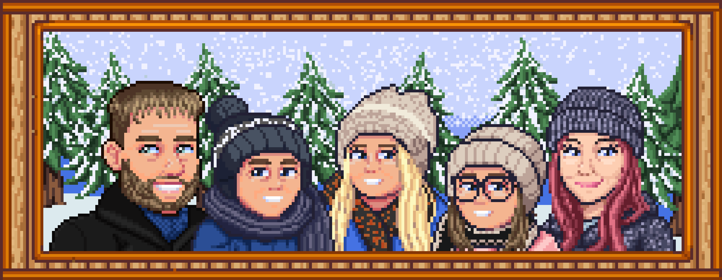 Every year we commission a Fiverr artist for our family Christmas card, can you guess what my wife and kids are obsessed with lately? by r0wo1 Stardew Valley