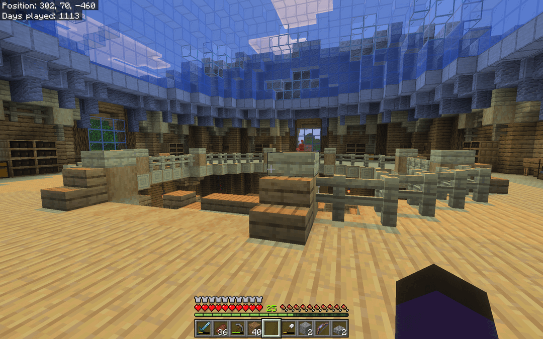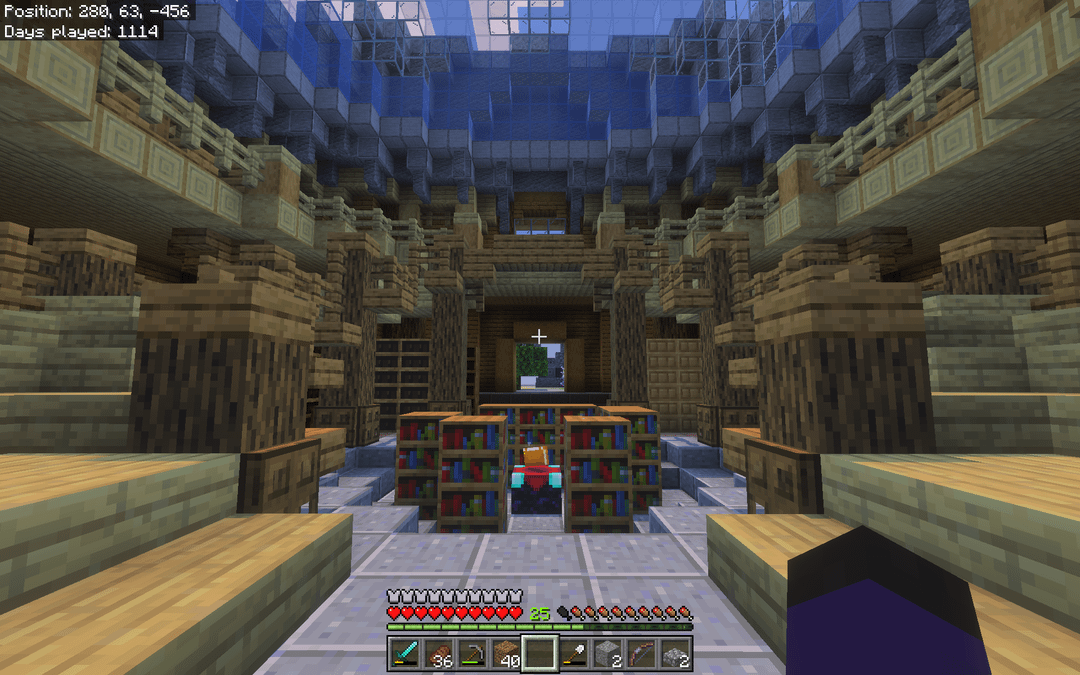 Recently finished this enchanting hall I set up in my long-term survival world. It was in the perfect spot, a small island with a nether portal on the edge. I plan on repairing the portal and connecting it to my nether hub eventually.