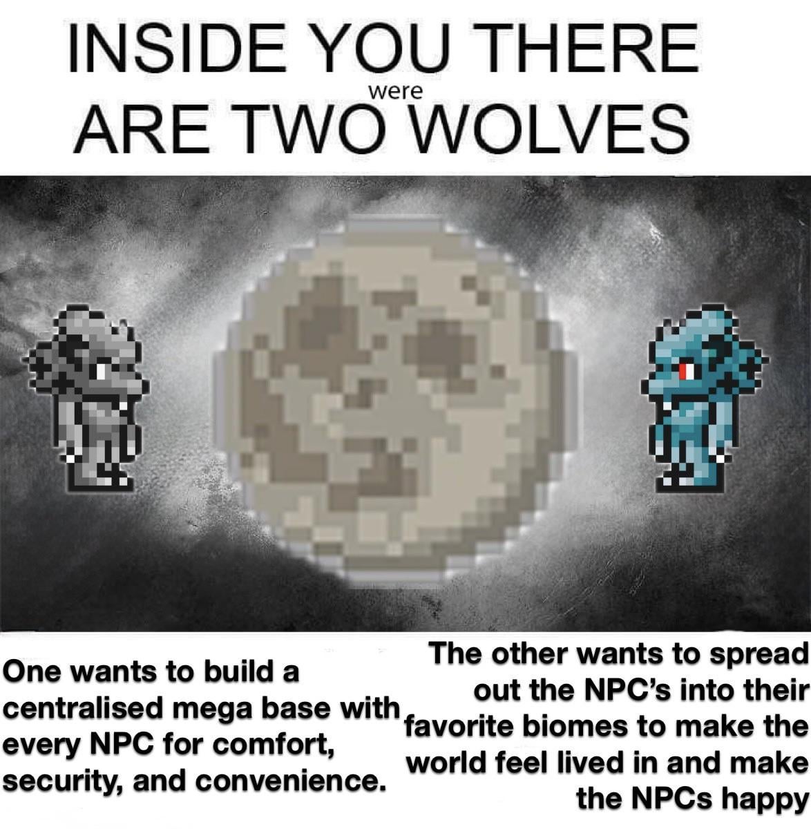 There’s also the third wolf: psychotic fucked up wolf that shoves NPC’s into shoulder wide boxes with a single torch table and chair to make them suffer their entire mortal life by EAT_UR_VEGGIES Terraria