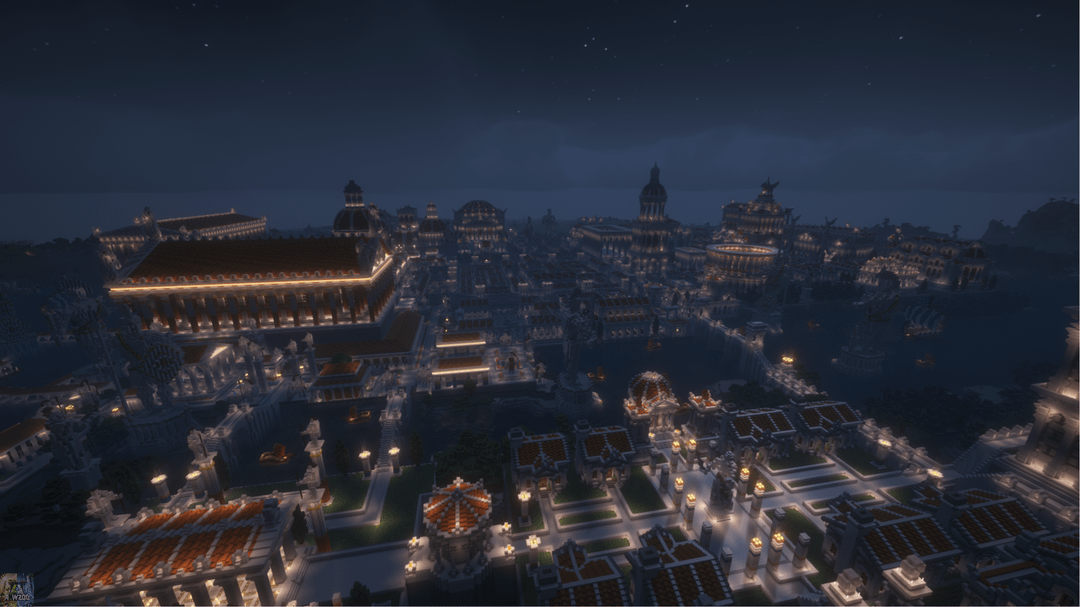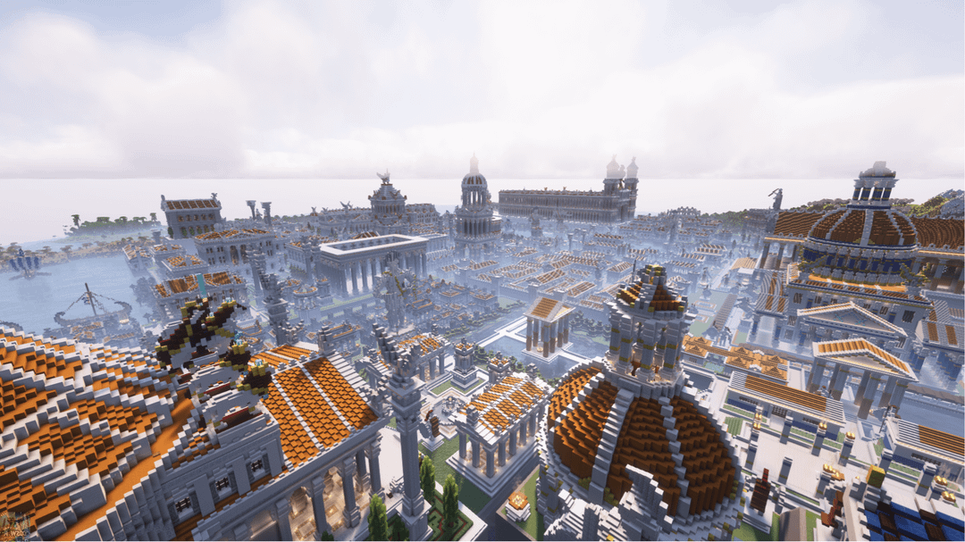 It includes temples, palaces, colosseums, statues, royal tombs, residential areas, and military camps, all connected through roads and open plazas.