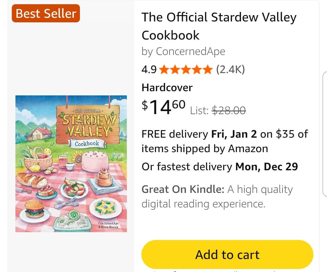 i got this from my boyfriend this year for christmas and absolutely loved it! having a stardew birthday party in january and him and his mom are going to make stuff out of the book 🙂