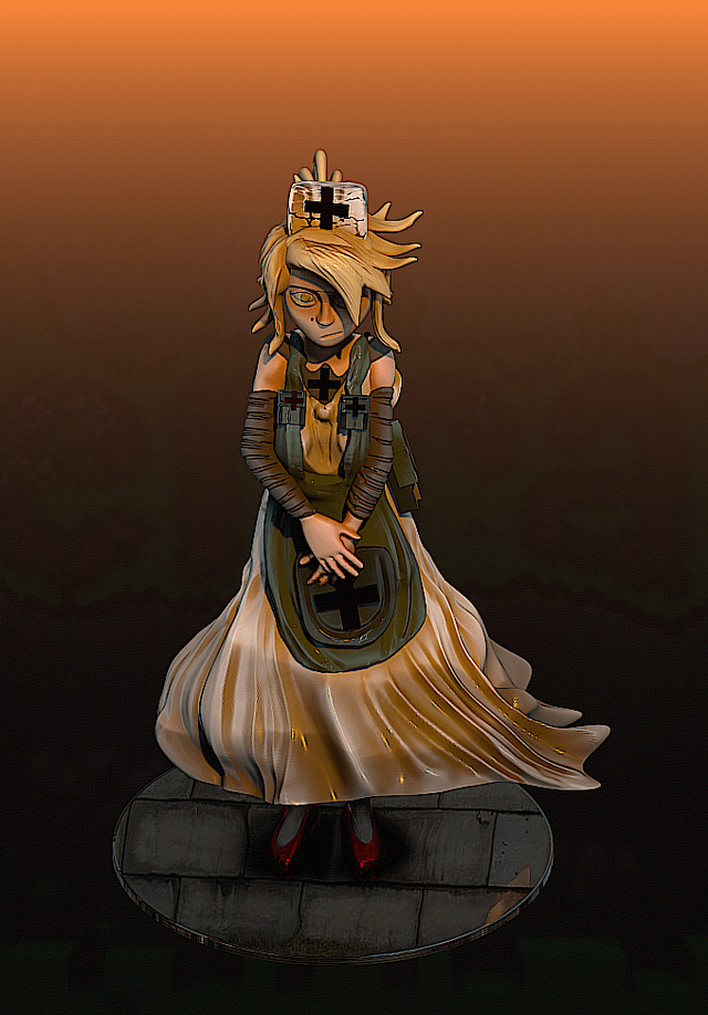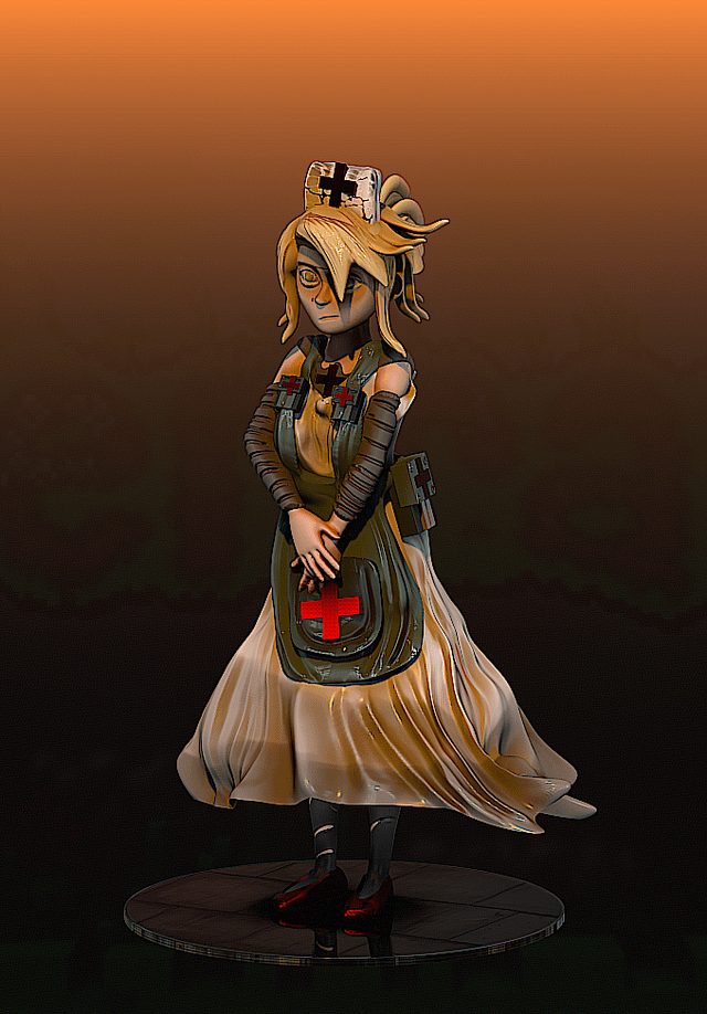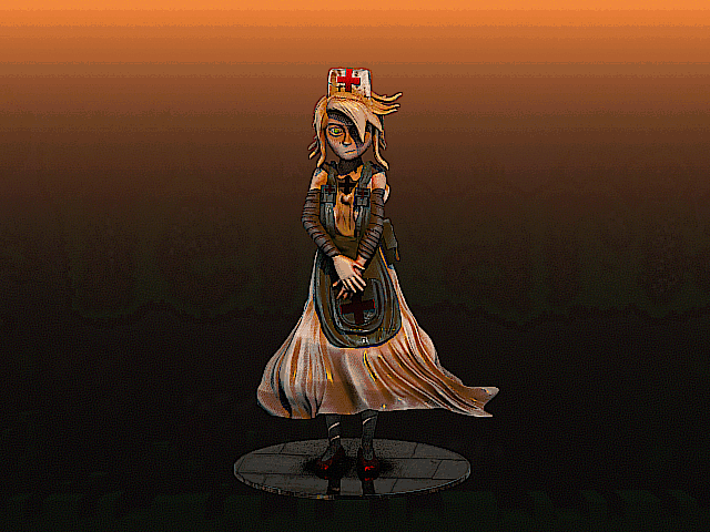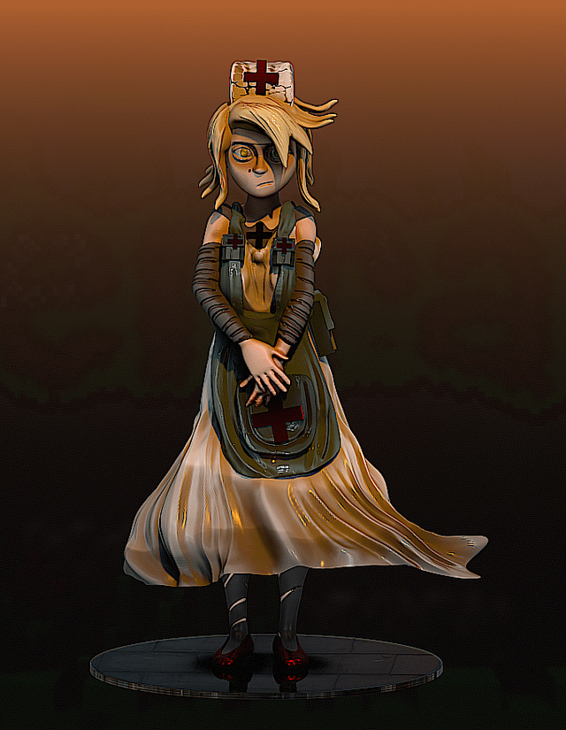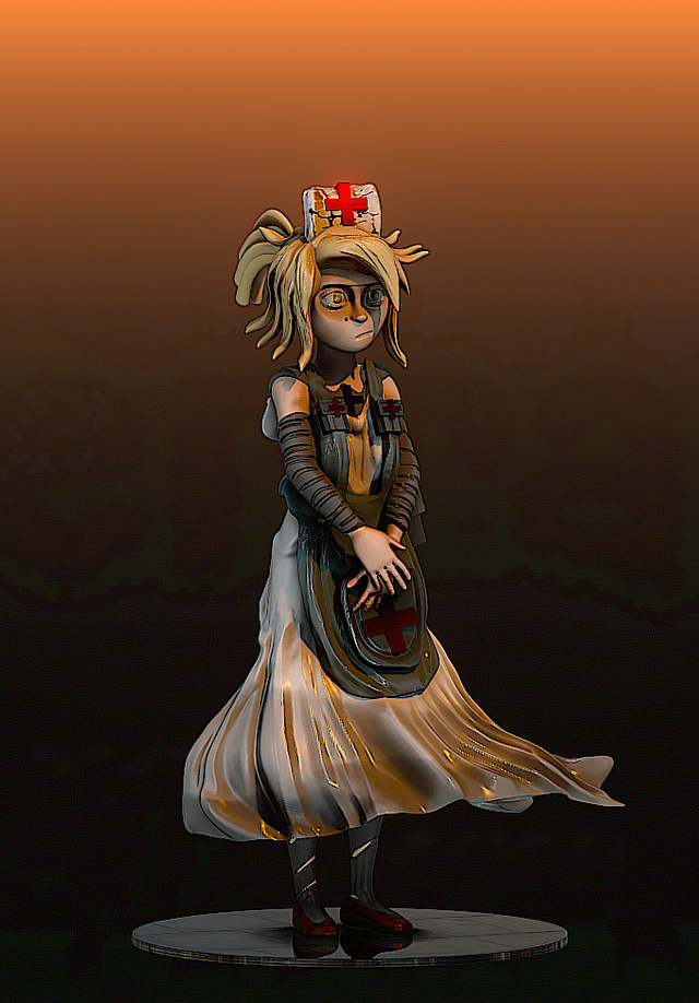 Well, this is my first model posted this year. Thank you everybody for your advice on my first version of the nurse. This time, I tried to make her hair without tubes, so I just modeled it. I also removed the glowing eyes and smoothed her skin, so it doesn't look like it's made out of parts. I also gave her a medical apron and some other changes to her design. Anyways, hope you like it :3