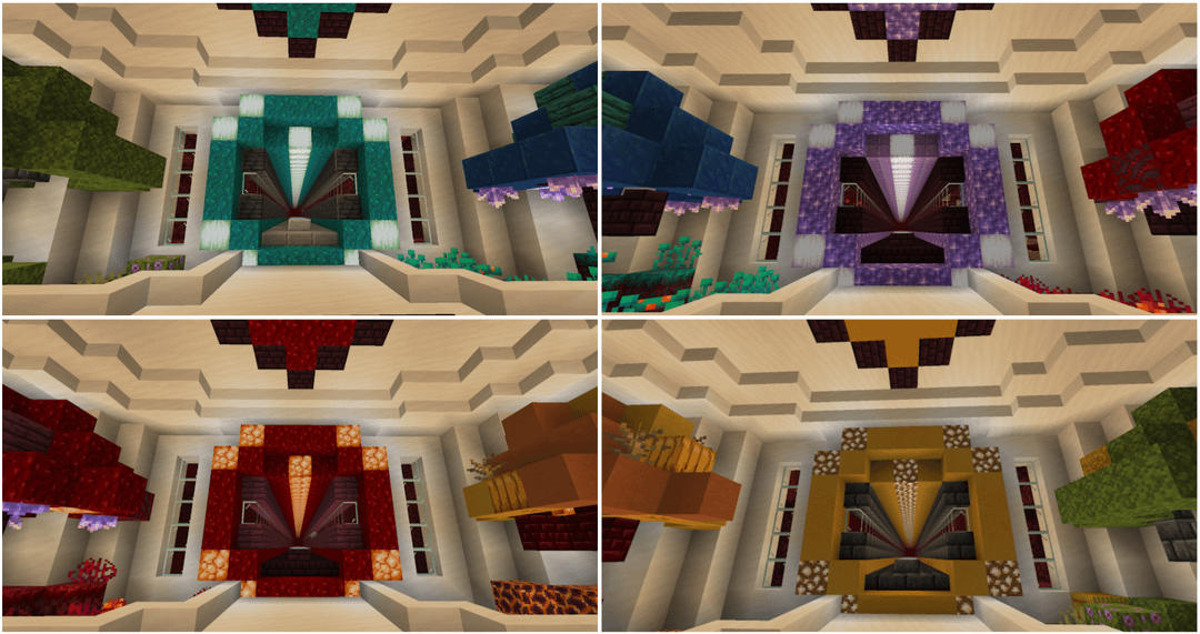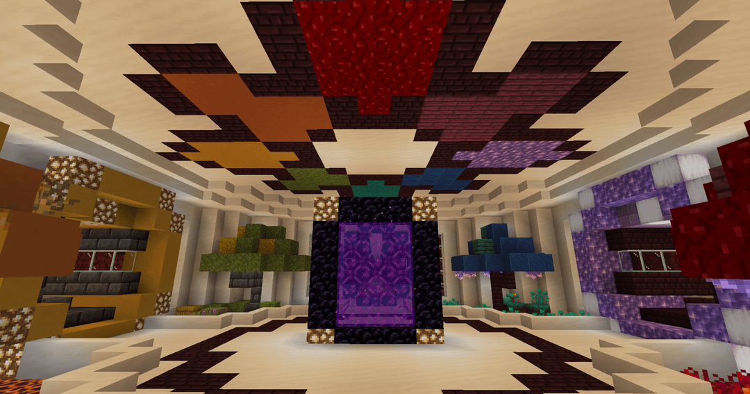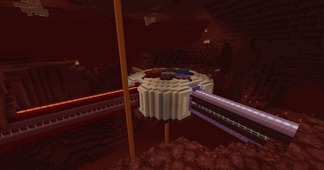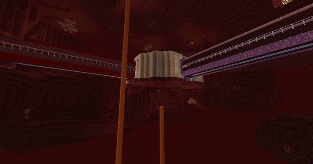 - The red tunnel with crimson planks and nether brick leads to a Crimson Forest and Nether fortress.