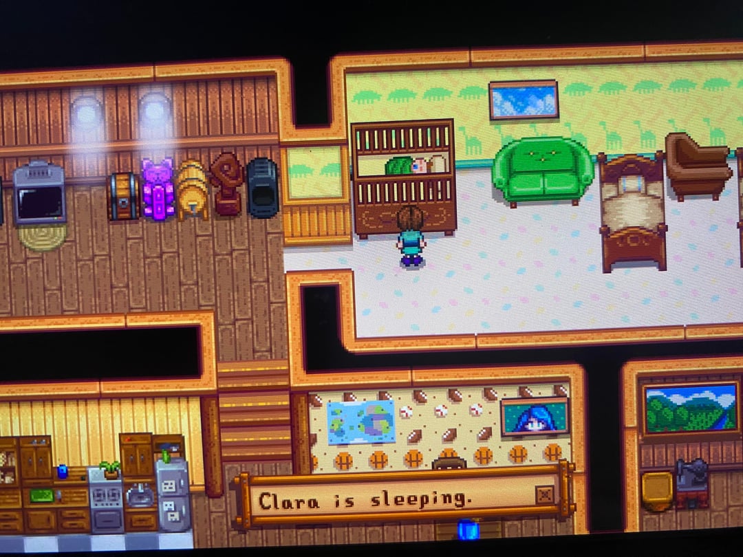 This was one of my first playthroughs and I had gotten attached to Alex after his heart event involving his mom and ended up marrying him so I had named our daughter after his mom. Also Alex was the one who replaced the wallpaper in the room next to the kitchen and I'm cackling.