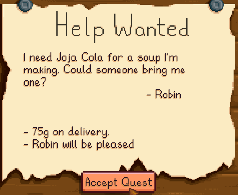 ExceedinglyOrdinary on January 7, 2026 1:27 pm Joja Cola soup sounds like something you’d get if you did Joja mart instead of Community Center. It’s effect should be it immediately knocks you out