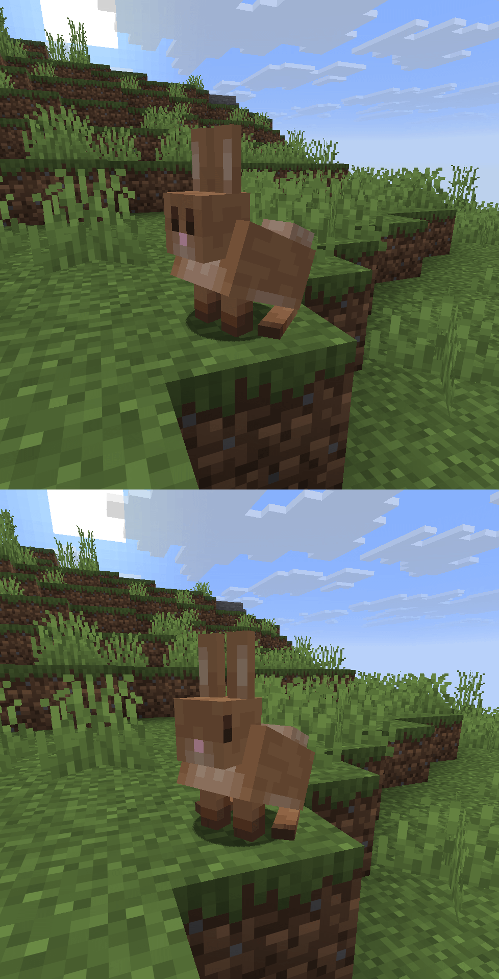 It looks great from the side but it’s going to have the same problem as the armadillo once you look at it straight on. A texture pack could maybe fix this though by changing the rabbits head to be SLIGHTLY angled, changing it from being a perfect cube to almost perfect, which would allow the eyes to be seen head on but wouldn’t exactly fit with modern Minecraft art style