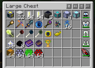 The goal of the playthrough was to obtain all these items for a prestige point. These points are persistent across multiple seasons / resets on our server and only one can be obtained per season per player. They allow you to buy advantages for further playthroughs of the pack. The items in the chest are endgame items from many major mods: IC2 / GT2, Thaumcraft 3, Twilight Forest, Xeno's Reliquary and Forestry