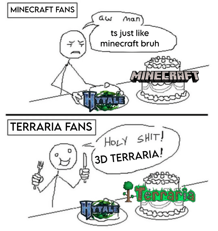its. not. 3d. terraria. its more like cube world if it was actually cute. hytale doesnt have bosses, which is the biggest part of terraria.
