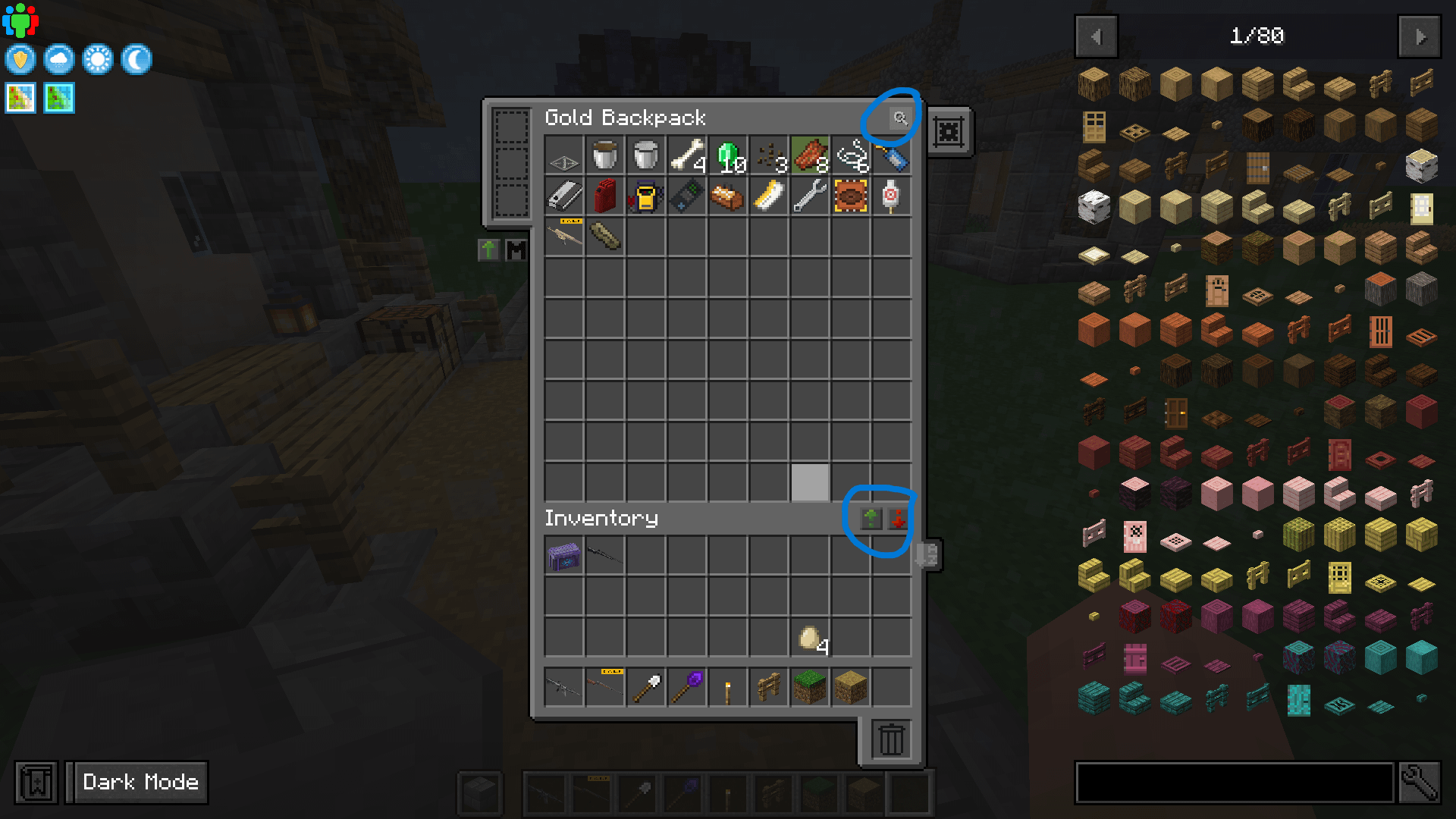 I want to get rid of the blue circled buttons but have no idea what mod added them. They only show up in the Sophisticated Backpacks (SB) inventory UI, but don't belong to that mod. (The SB buttons are on the left). by STR4NGER_D4NGER Minecraft Minecraft Java Edition Modded Minecraft