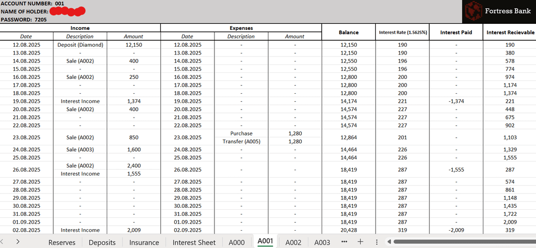 Step 2: INTEREST! Yes, like basically every bank on earth, Fortress Bank pays interest of 1.5625% per day (rounded down to the lowest integer), compounding every week. Why pay interest? To provide incentives for players to make their deposits, since it means depositing as early as possible means you get less affected by inflation and means you can afford stuff more easily.